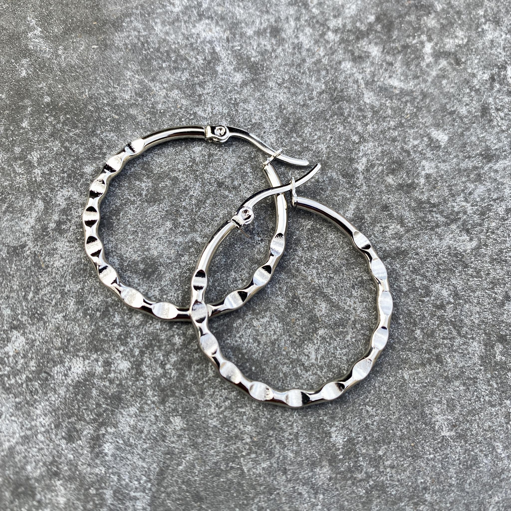Hringlokkar úr ryðfríu stáli, hömruð áferð. Þessir koma í tveimur stærðum: þvermál 2,5 og 3cm.