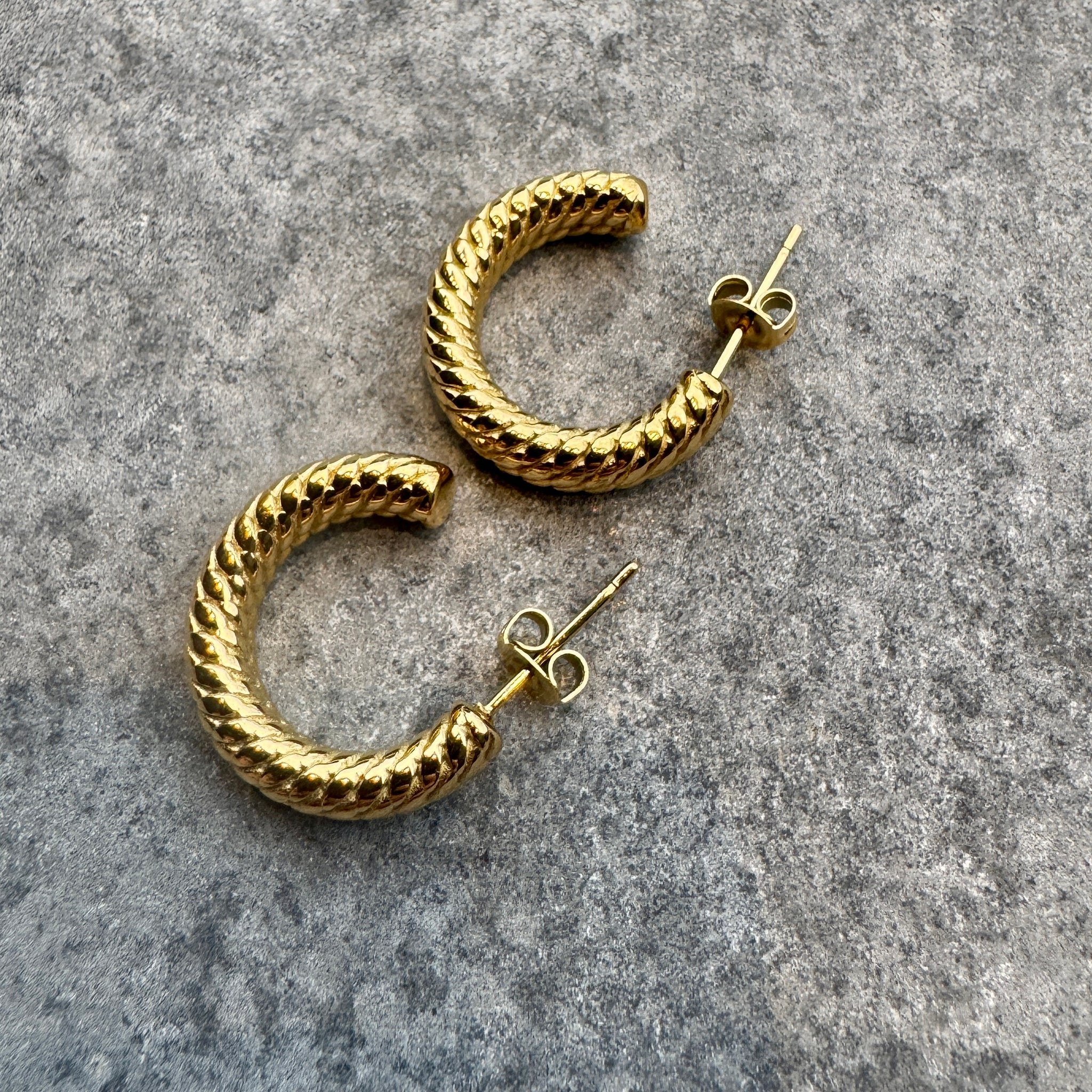 Fallegir lokkar með fínlegu myndtri, efni ryðfrítt stál. Stærð um 2.5 cm í þvermál