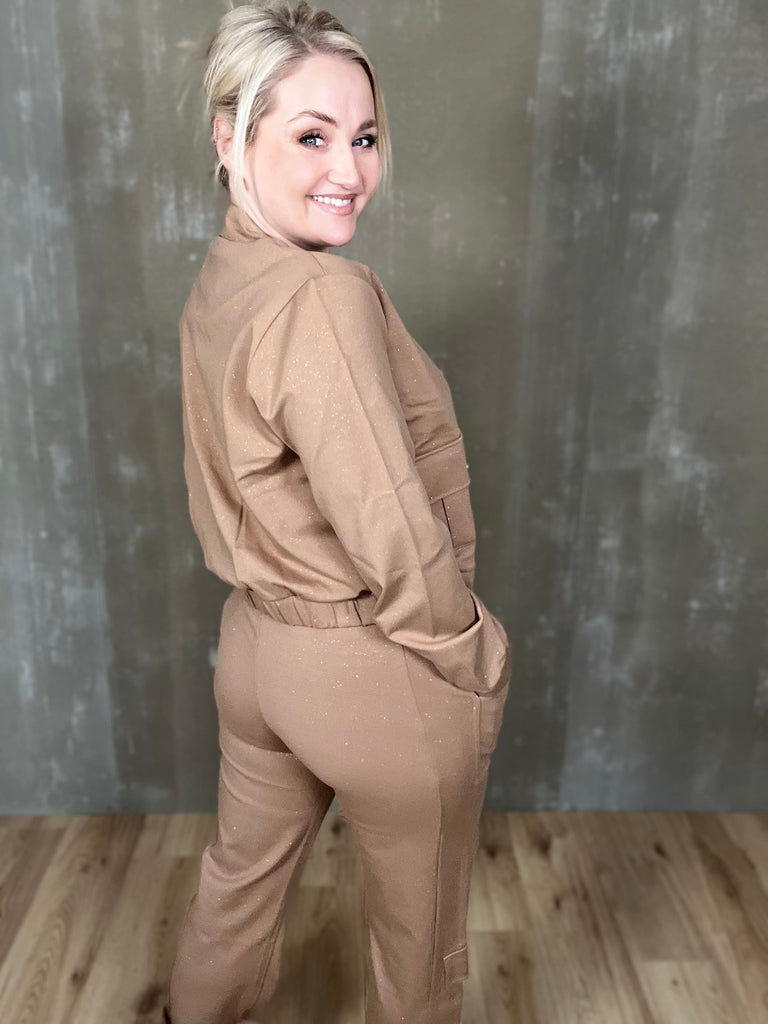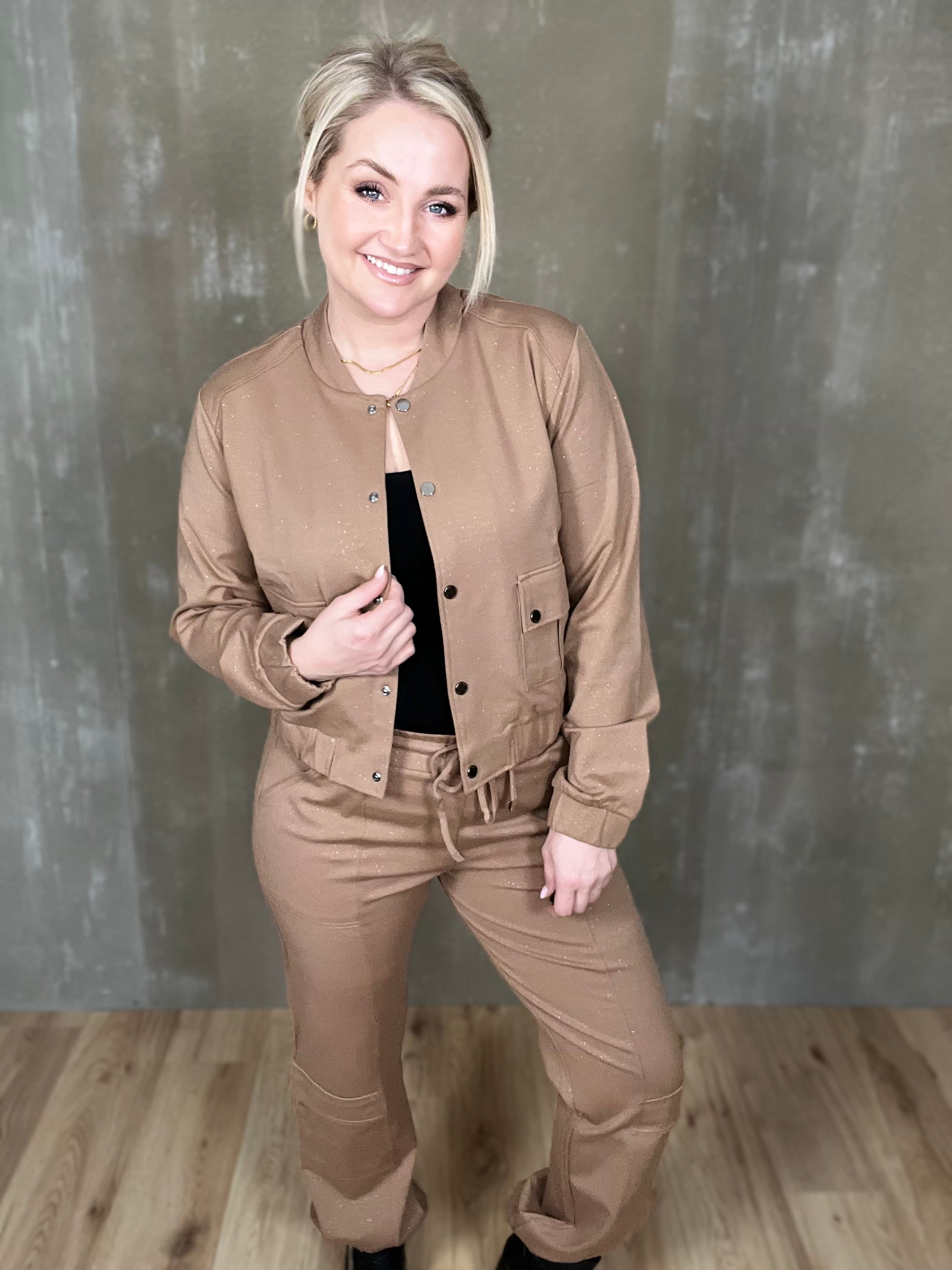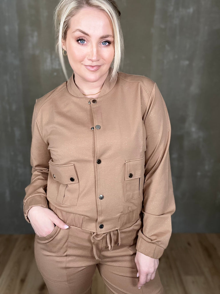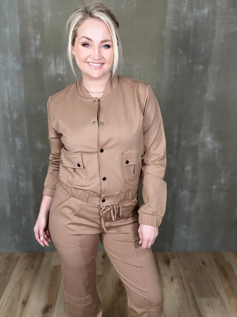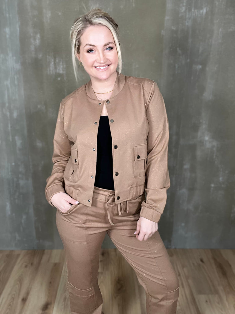 Skvísulegur bomberjakki með glitri. Þessi er partur af setti en stendur svo sannarlega líka einn og sér! Smelltur jakki úr mjúku ponte efni með góðri teygju, efnið er þó líka með hellings burði og heldur sér vel. Smart lokaður eða opinn, gæjalegur við buxurnar en passar einnig vel við sparilegar buxur eða jafnvel gallabuxur eða leðurbuxur.