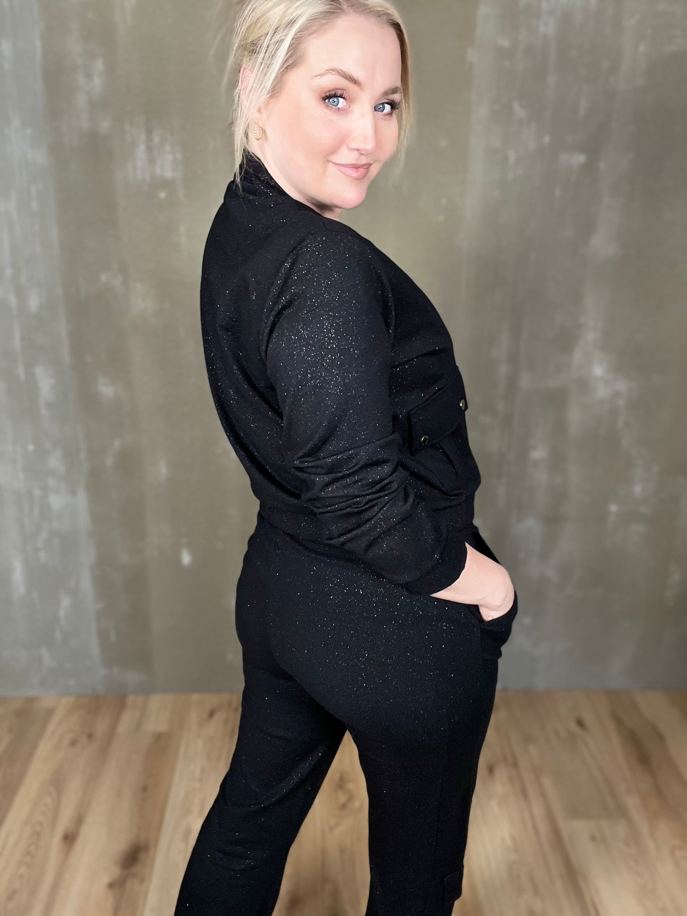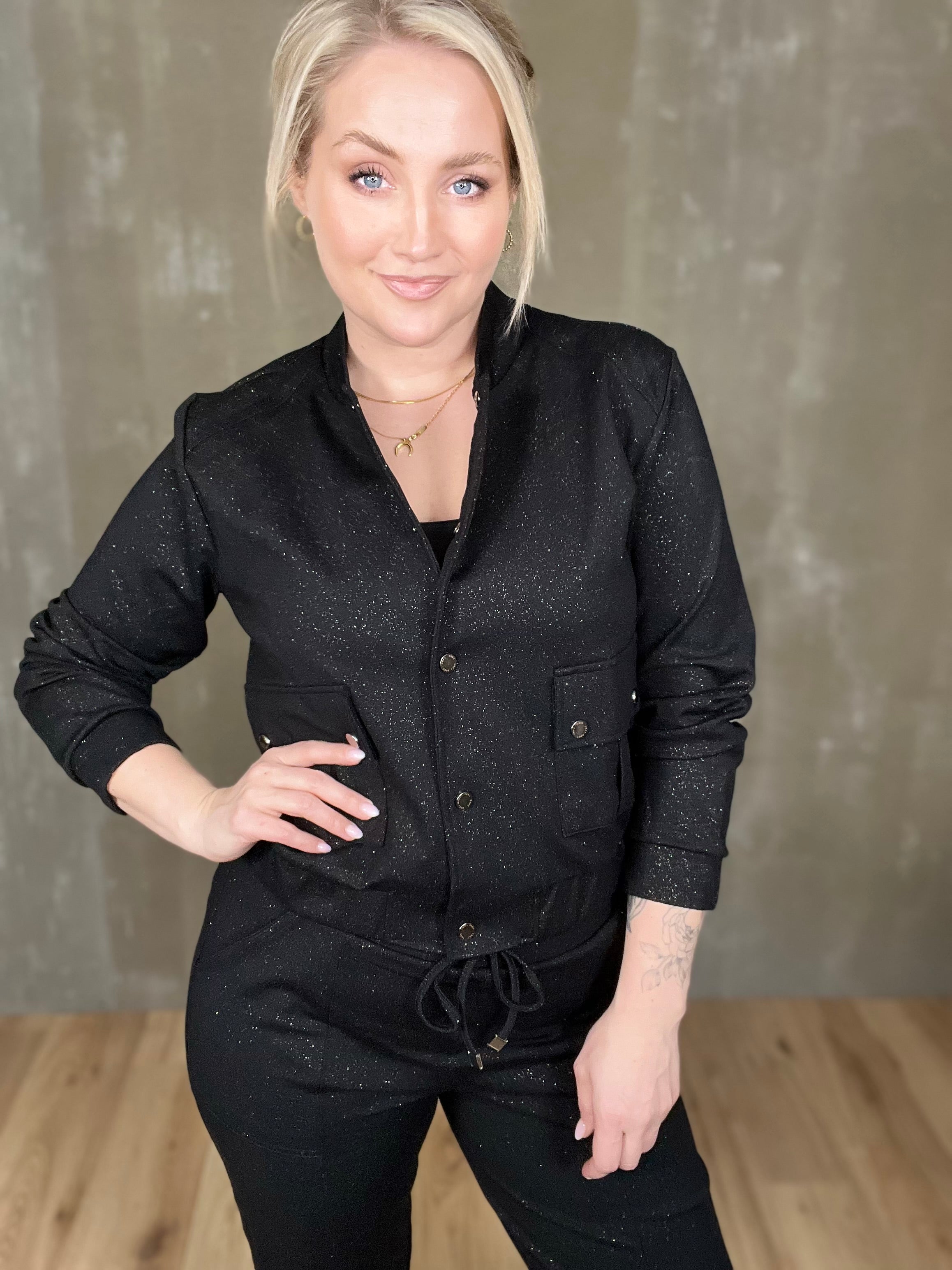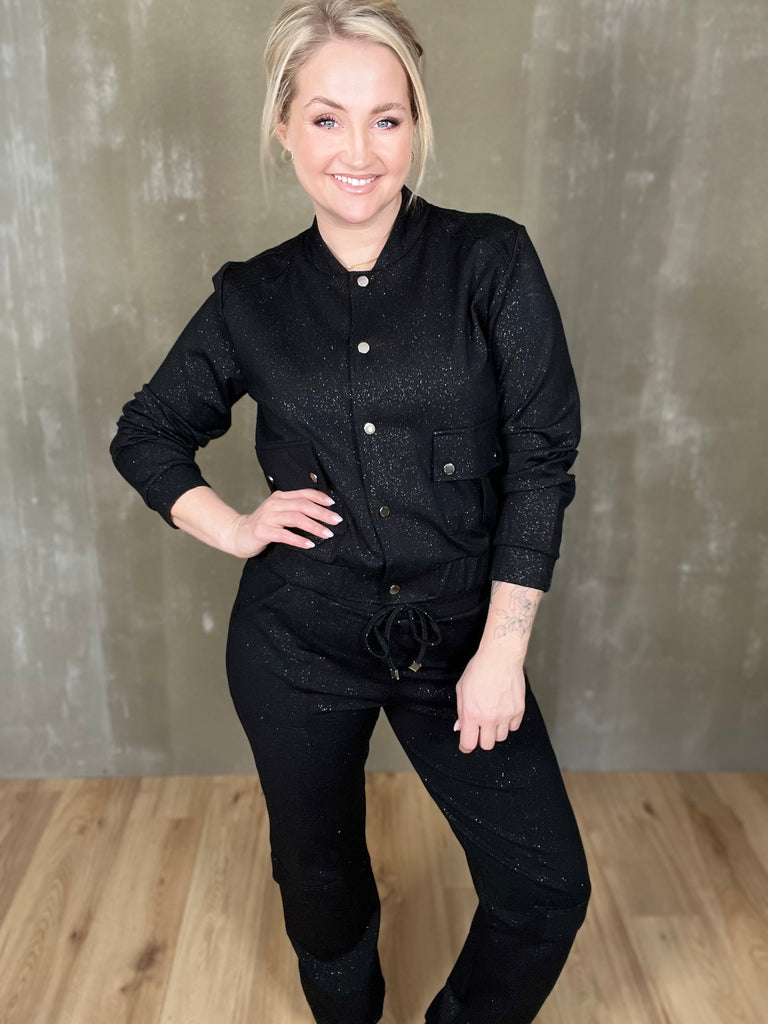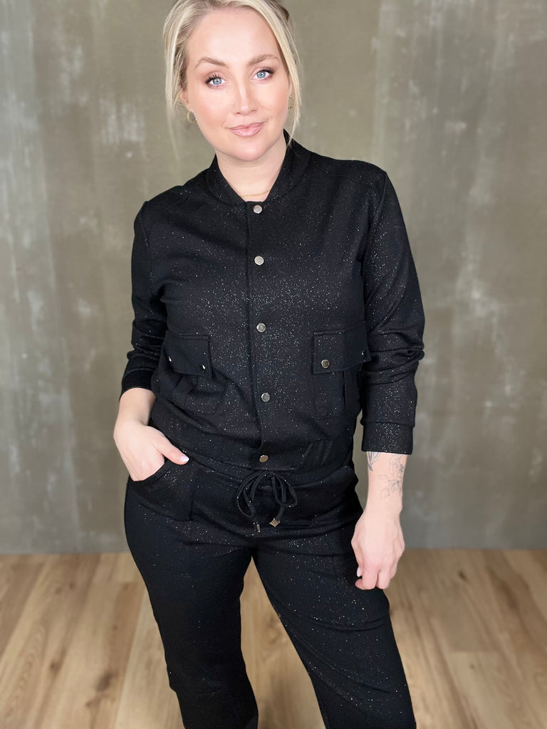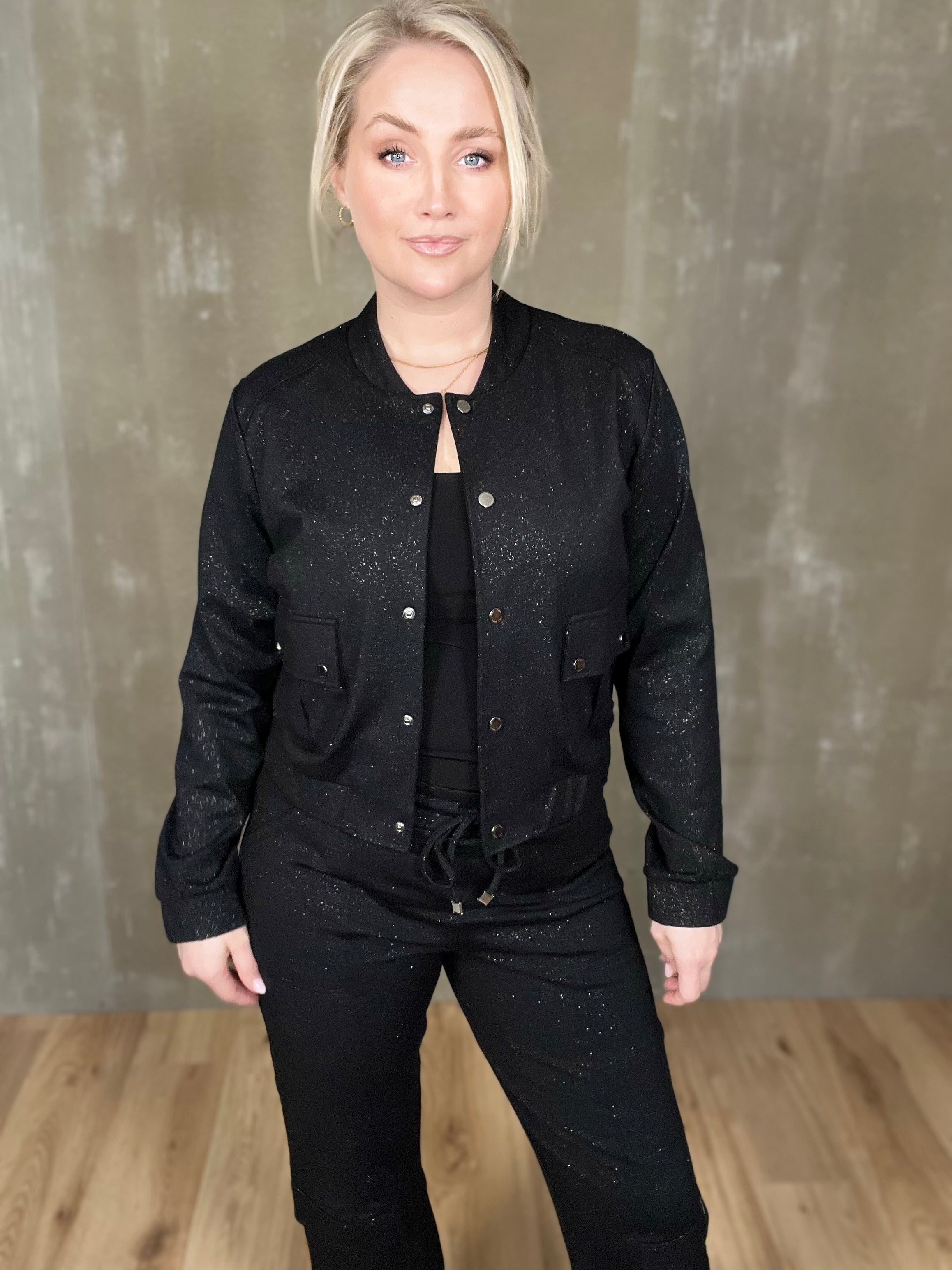 Skvísulegur bomberjakki með glitri. Þessi er partur af setti en stendur svo sannarlega líka einn og sér! Smelltur jakki úr mjúku ponte efni með góðri teygju, efnið er þó líka með hellings burði og heldur sér vel. Smart lokaður eða opinn, gæjalegur við buxurnar en passar einnig vel við sparilegar buxur eða jafnvel gallabuxur eða leðurbuxur.
