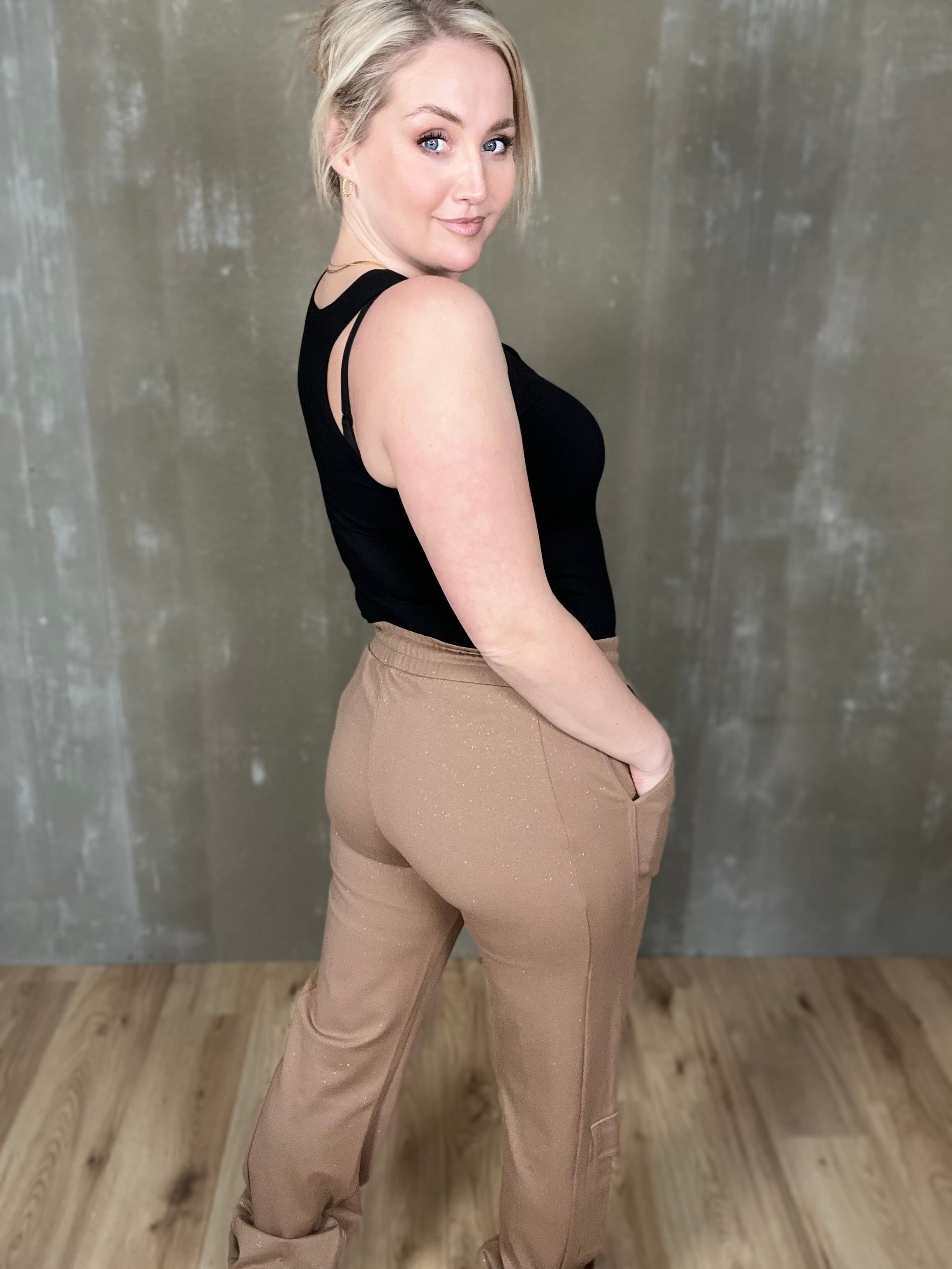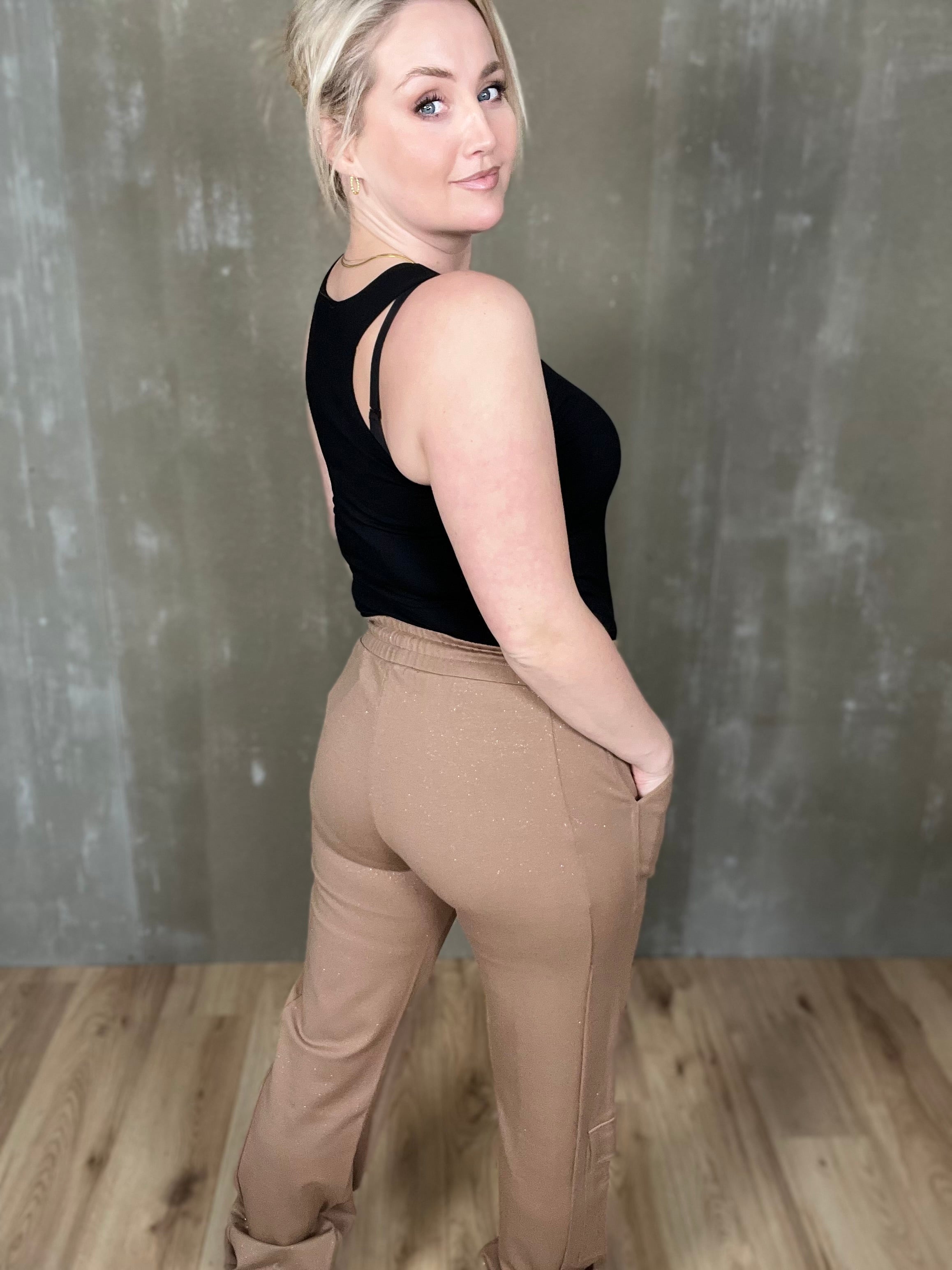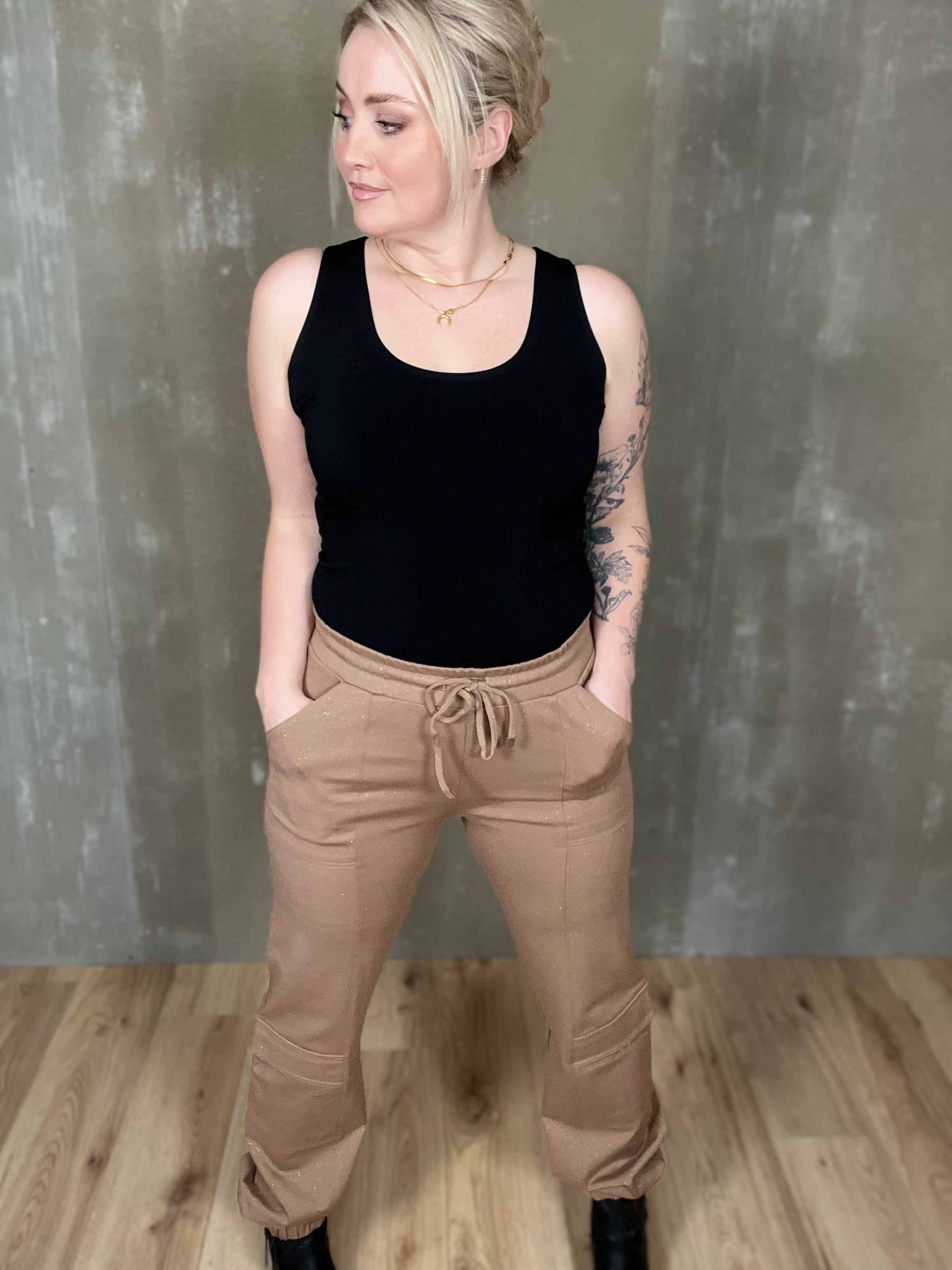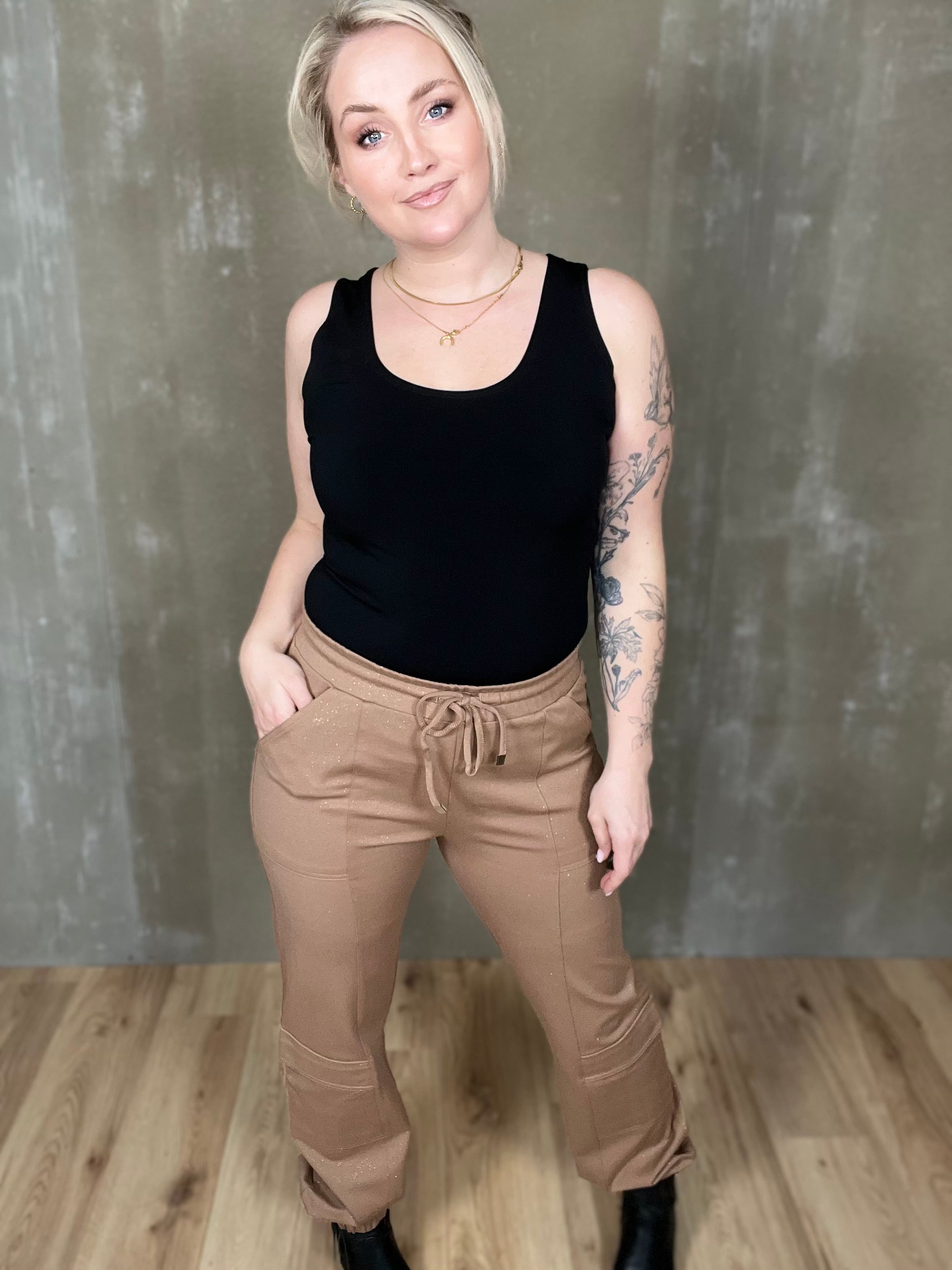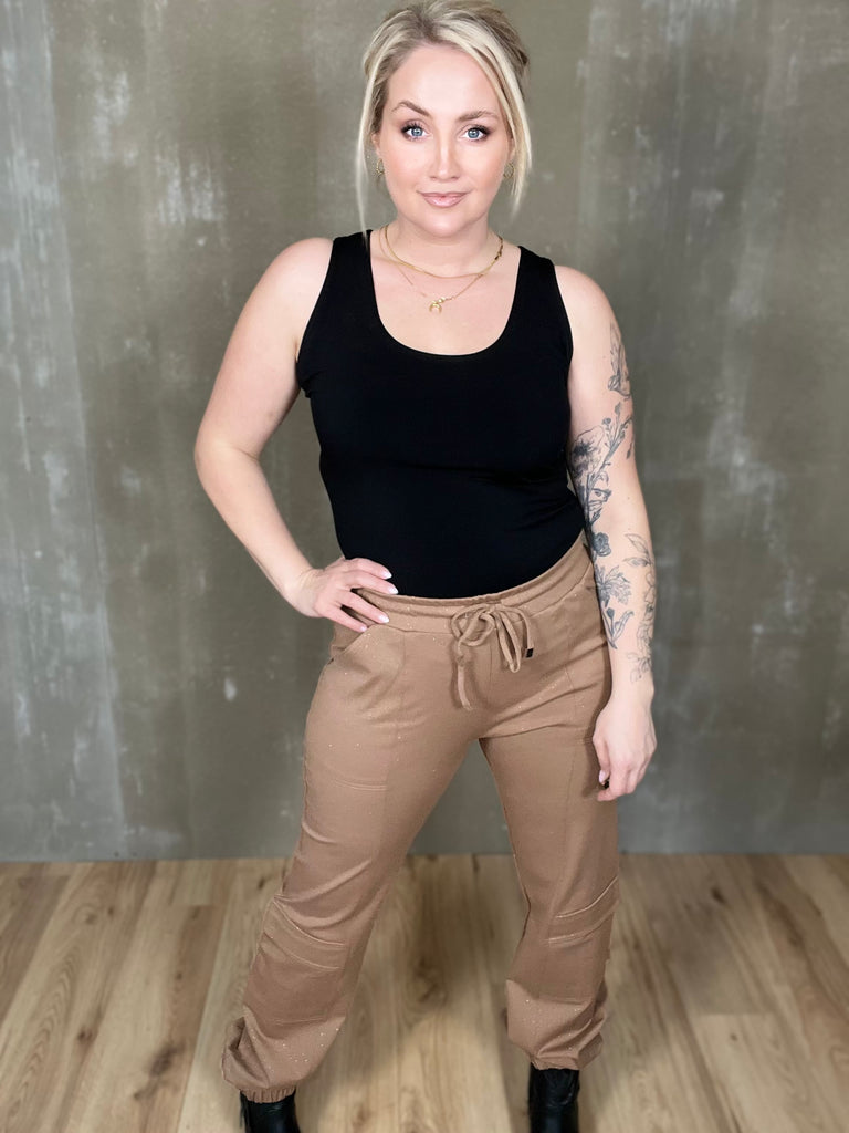 Maya buxurnar eru töffaralegar cargo buxur með glitri með góðum vösum og streng með teygju sem og stillanlegri snúru. Þær eru partur af setti en standa svo sannarlega líka einar og sér. Þær eru úr mjúku ponte efni með góðri teygju, efnið er þó líka með hellings burði og heldur sér vel. Þessar eru með teygju að neðan, eru vel síðar og vösum á hliðinni á skálmunum frekar neðarlega, hrikalega töff!