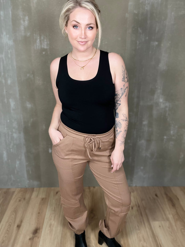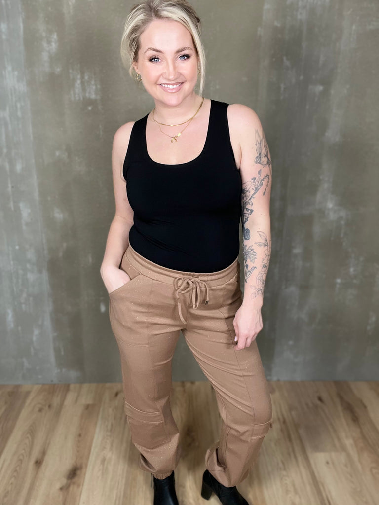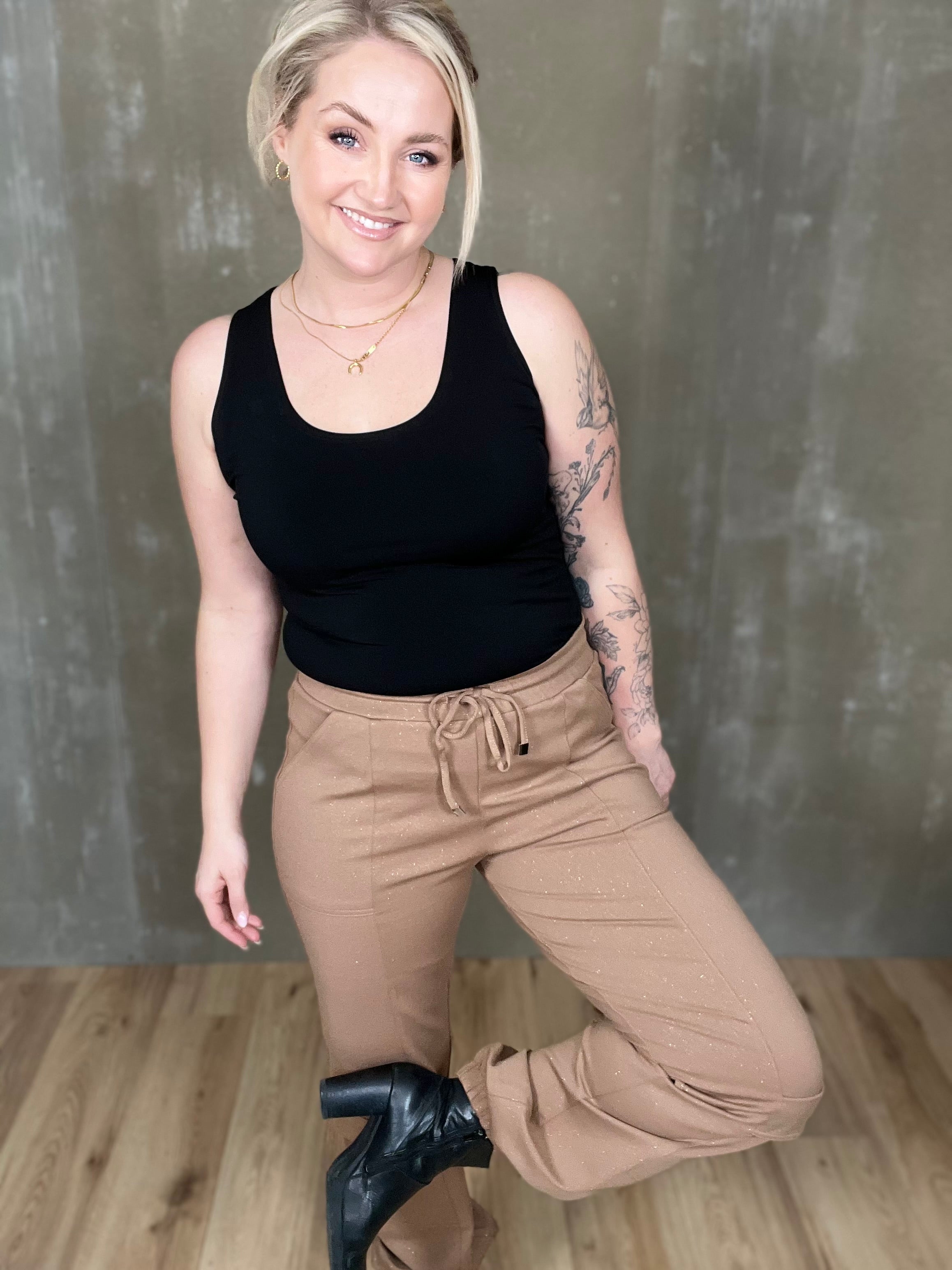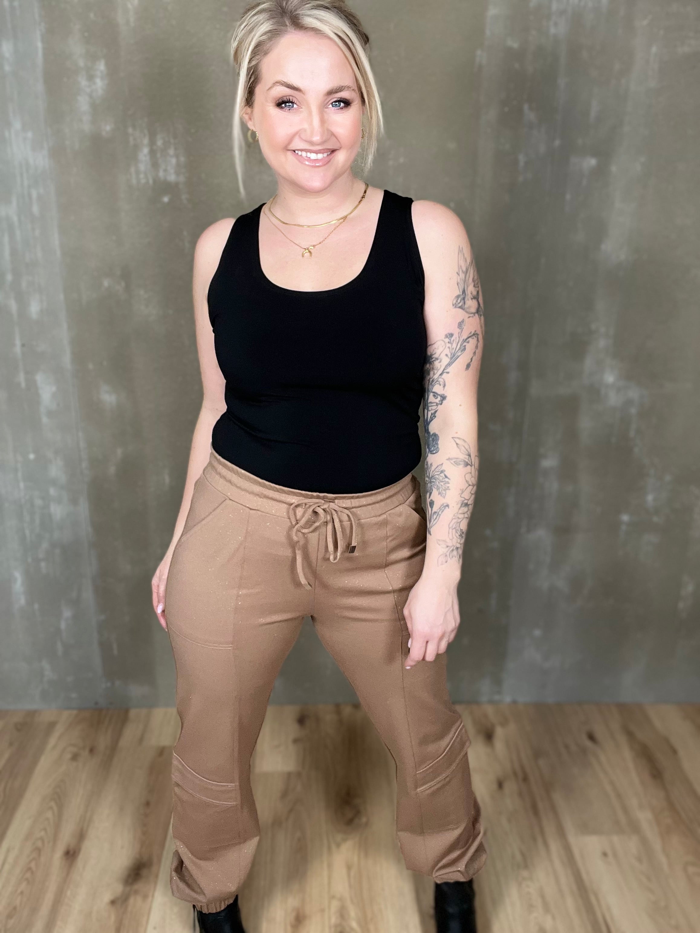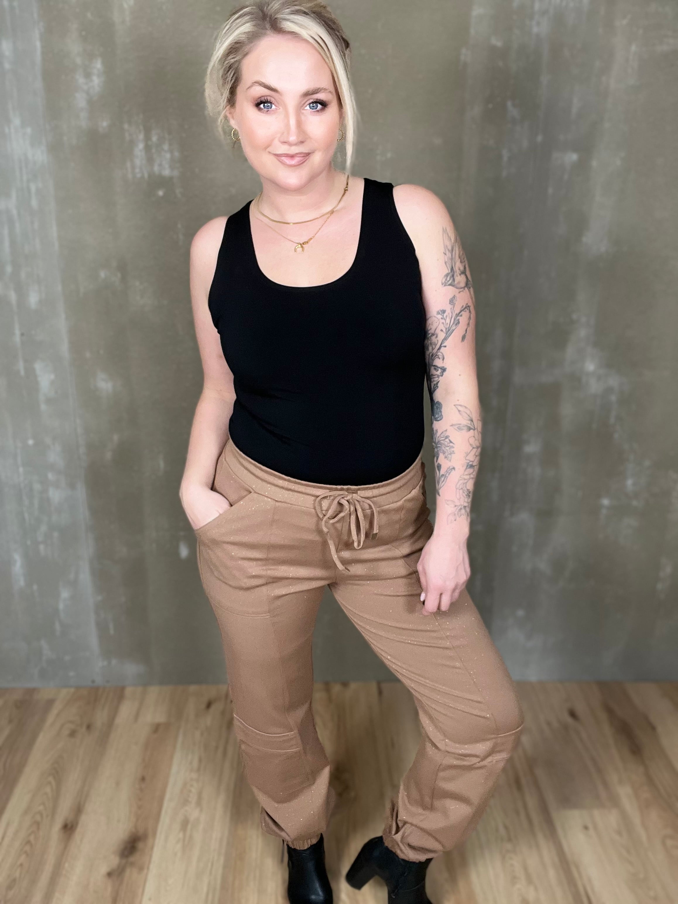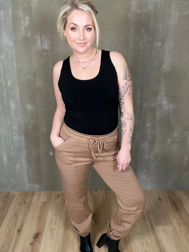 Maya buxurnar eru töffaralegar cargo buxur með glitri með góðum vösum og streng með teygju sem og stillanlegri snúru. Þær eru partur af setti en standa svo sannarlega líka einar og sér. Þær eru úr mjúku ponte efni með góðri teygju, efnið er þó líka með hellings burði og heldur sér vel. Þessar eru með teygju að neðan, eru vel síðar og vösum á hliðinni á skálmunum frekar neðarlega, hrikalega töff!