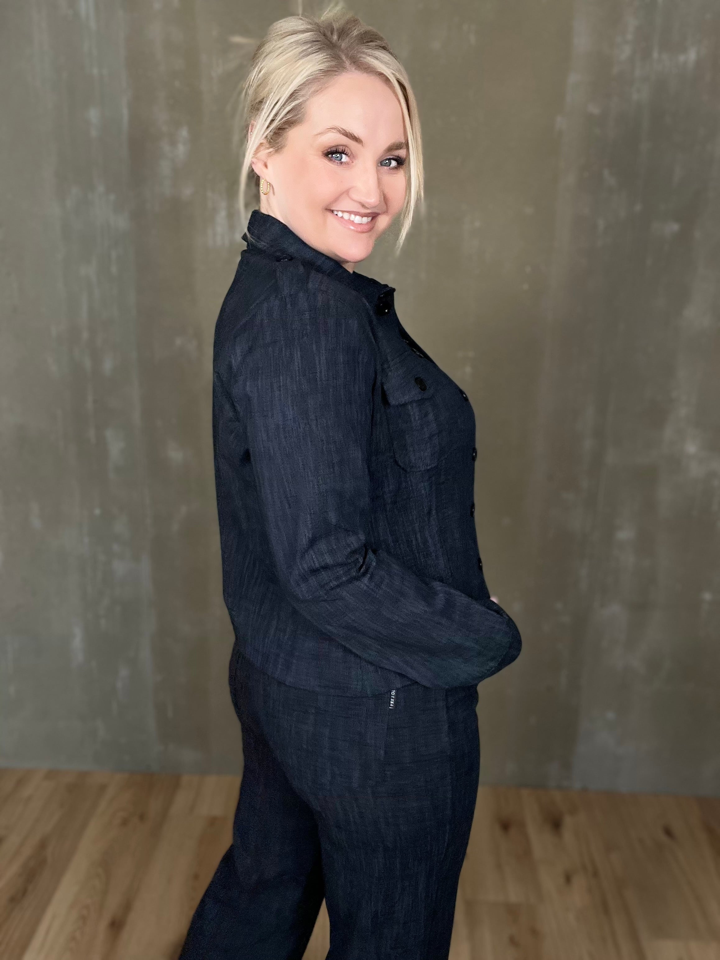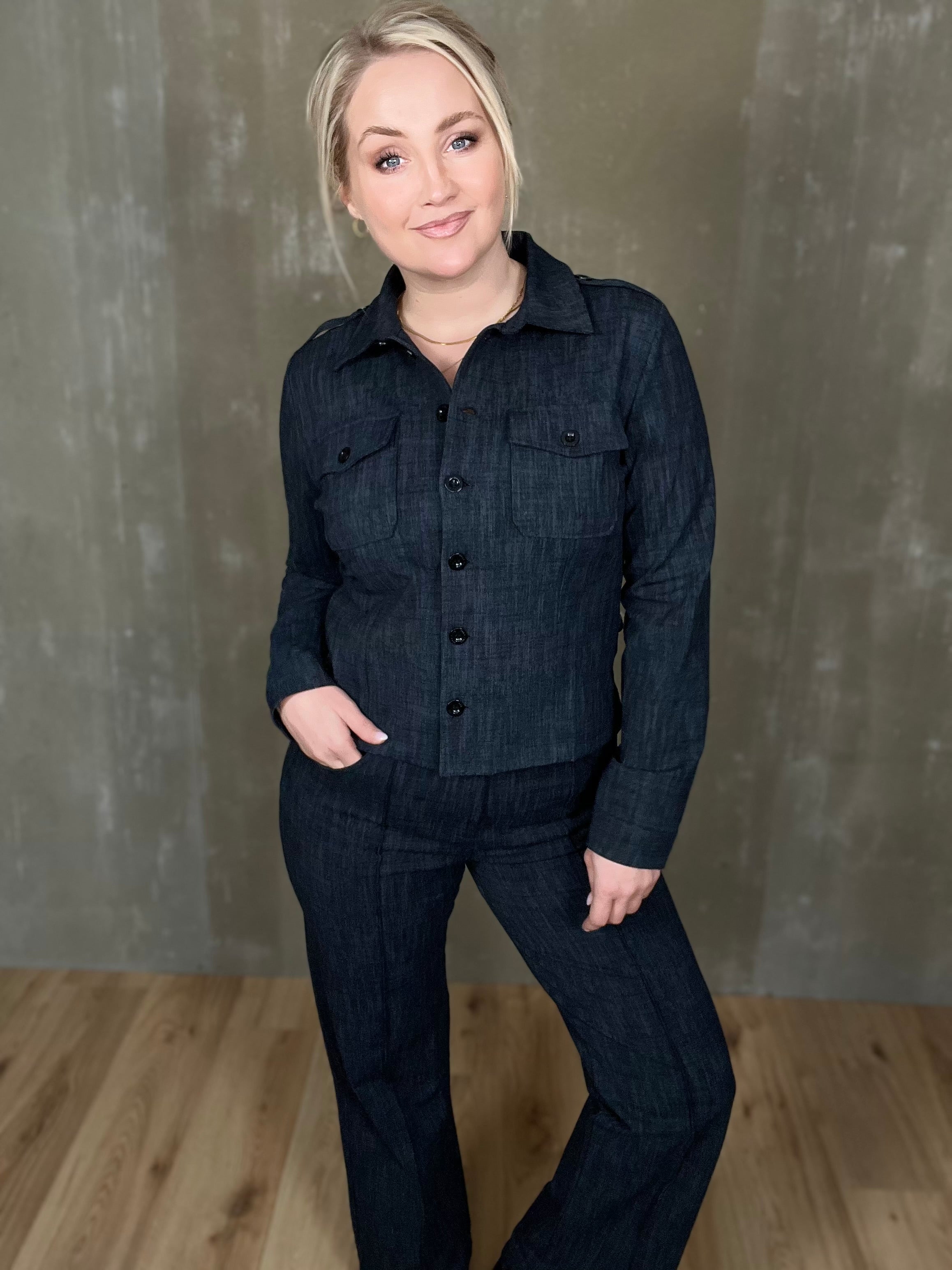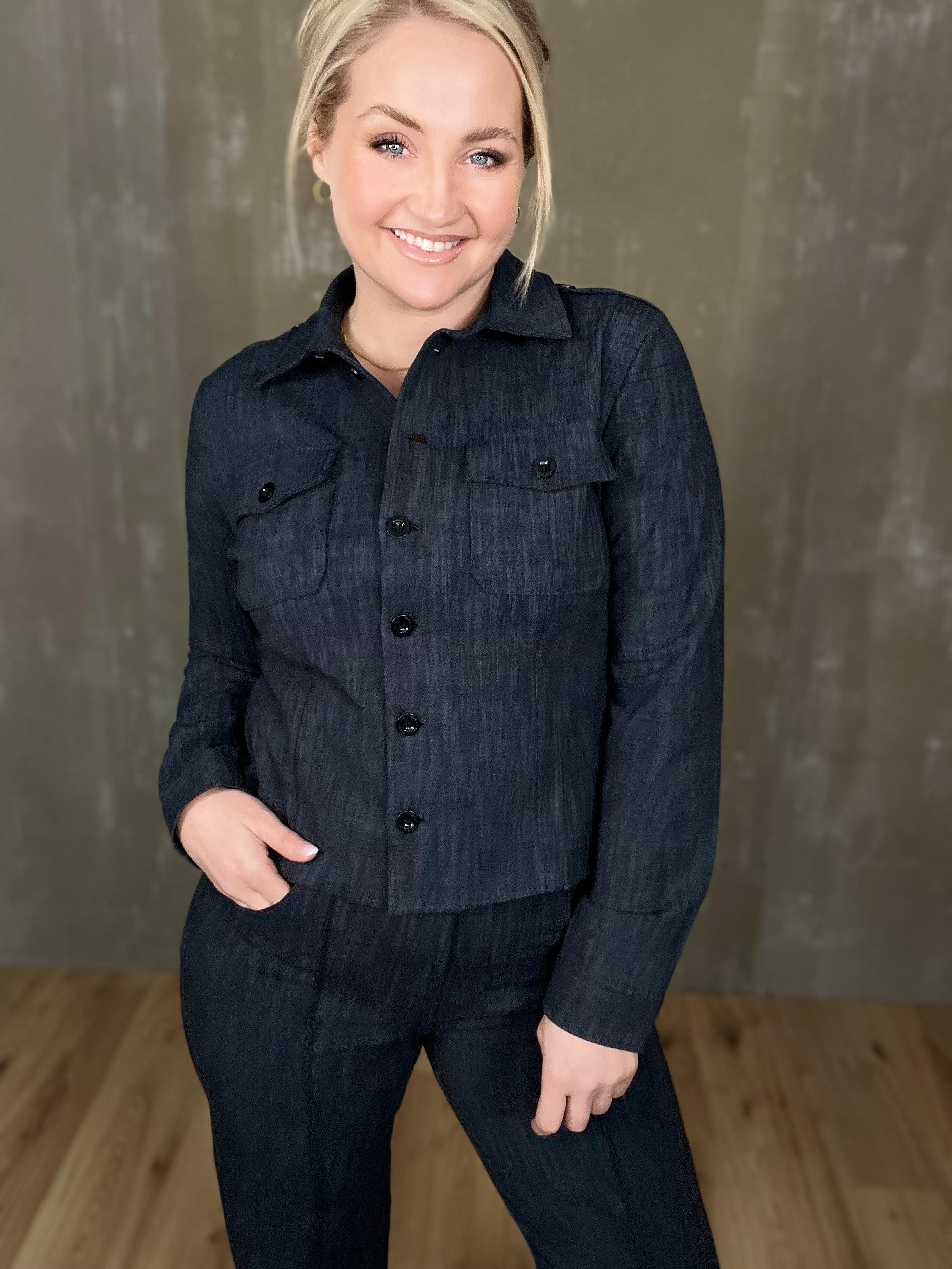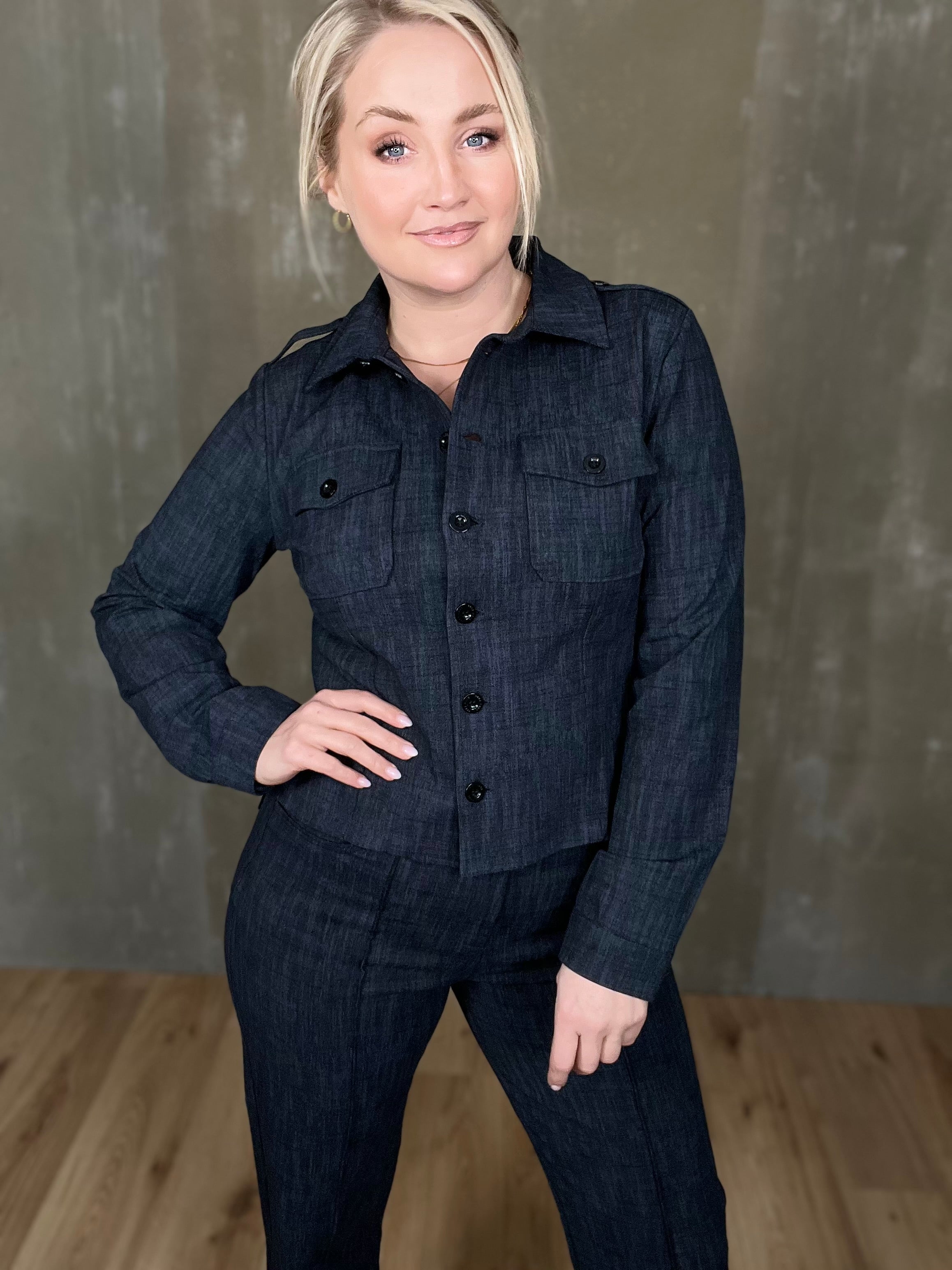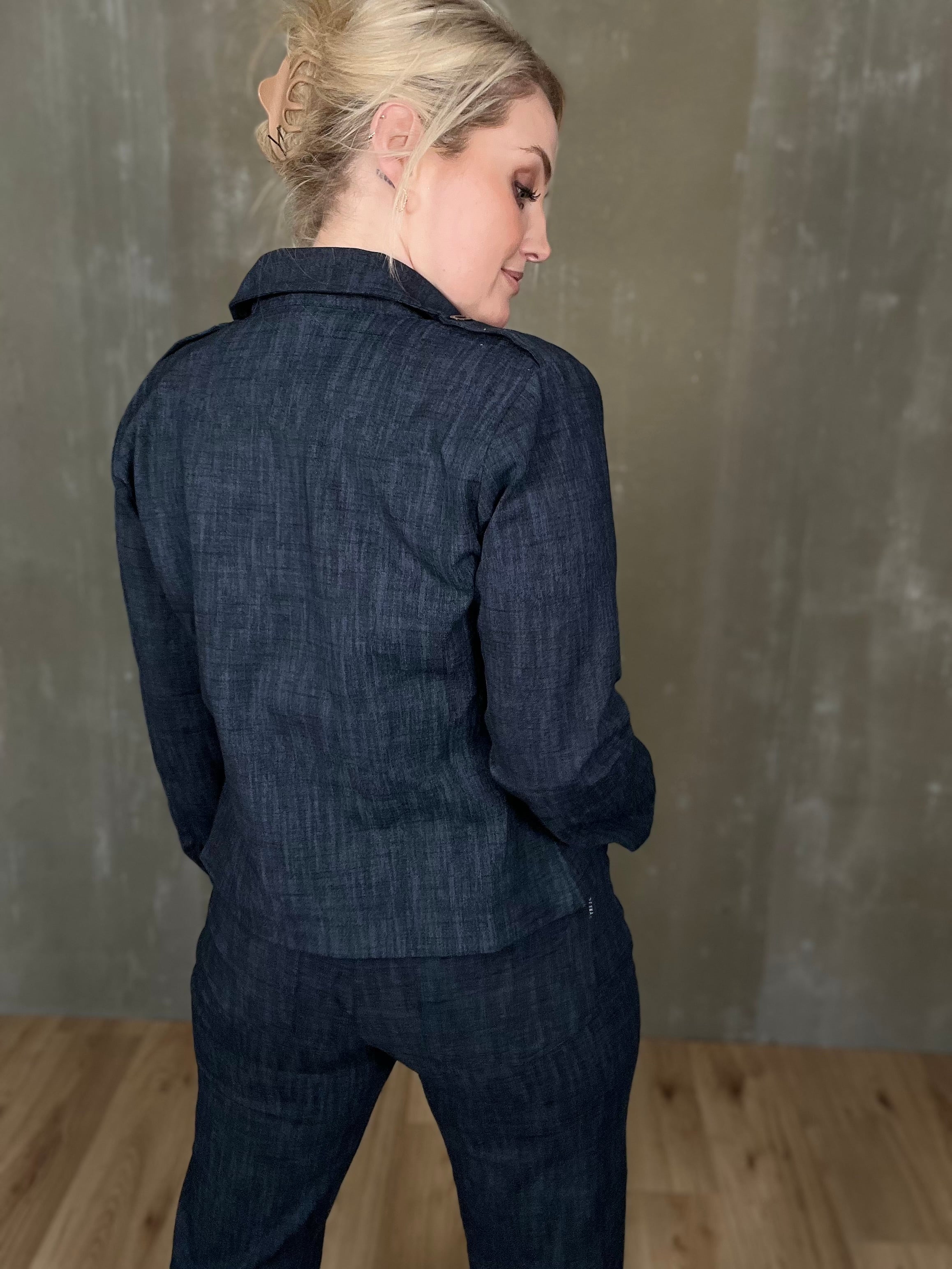 Milou jakkinn er úr sterku efni, með svörtum tölum og tveimur brjóstvösum. Hann passar einstaklega vel við Megan buxurnar fyrir fullkomið “complete outfit”! Töffaralegur efri partur sem eiginlega mitt á milli þess að vera skyrta og buxur. Bæði smart hafður opinn sem og lokaður.