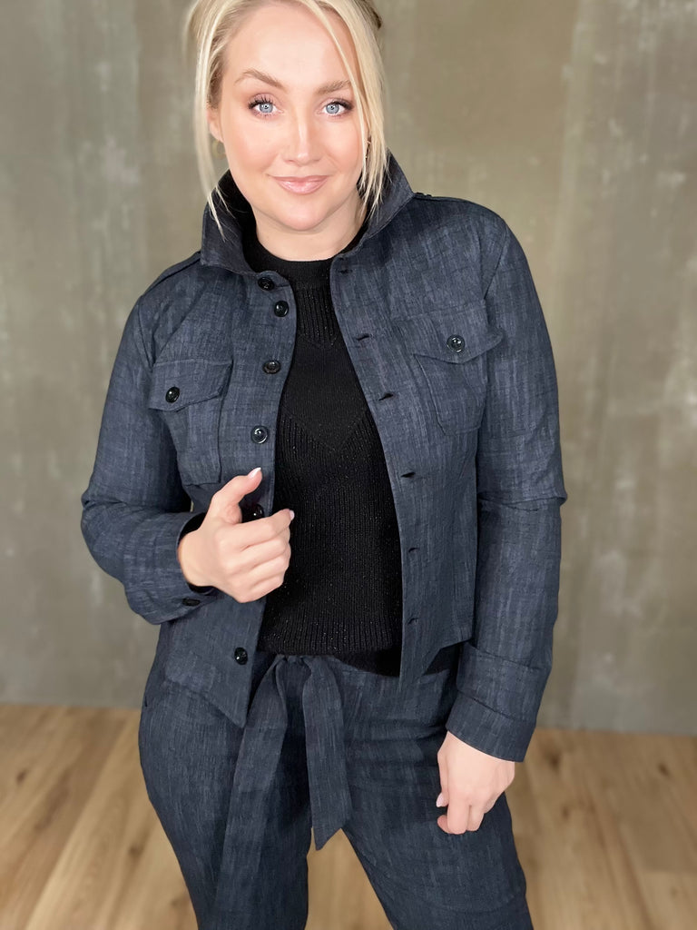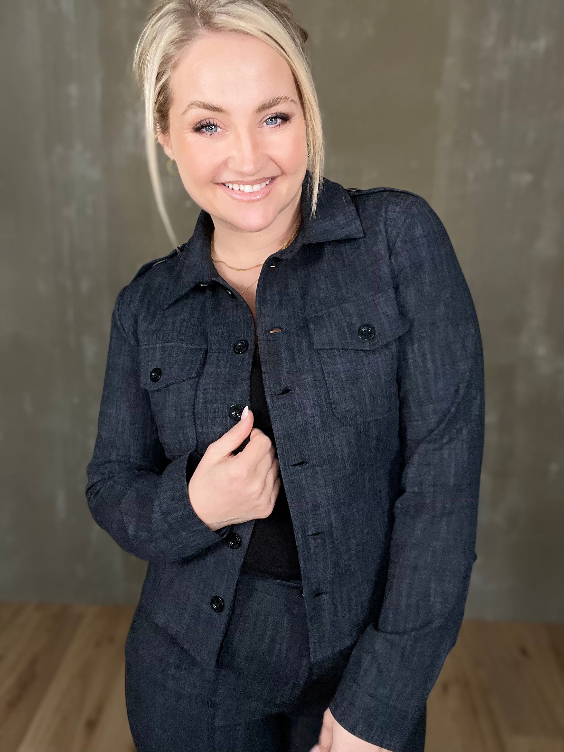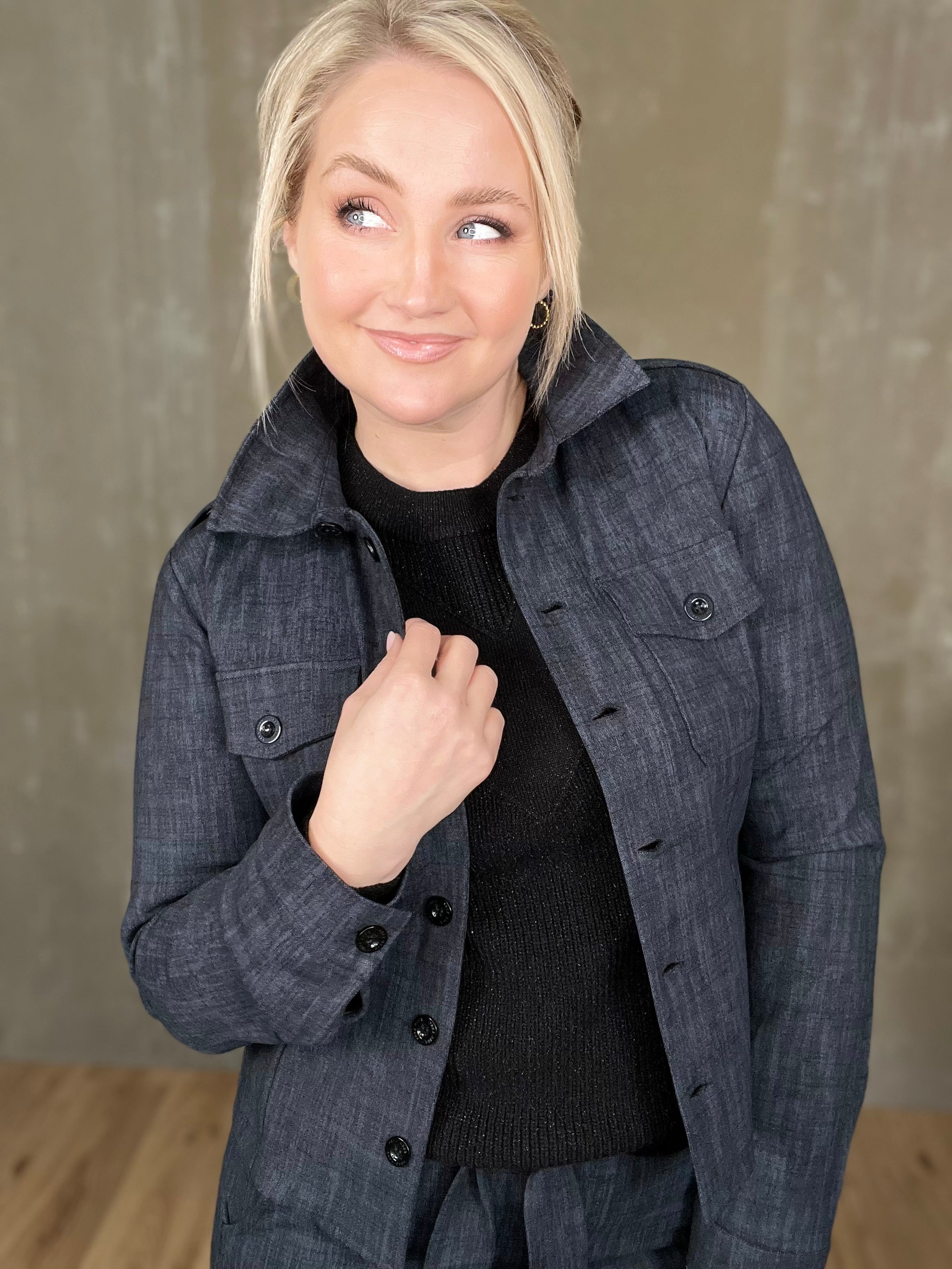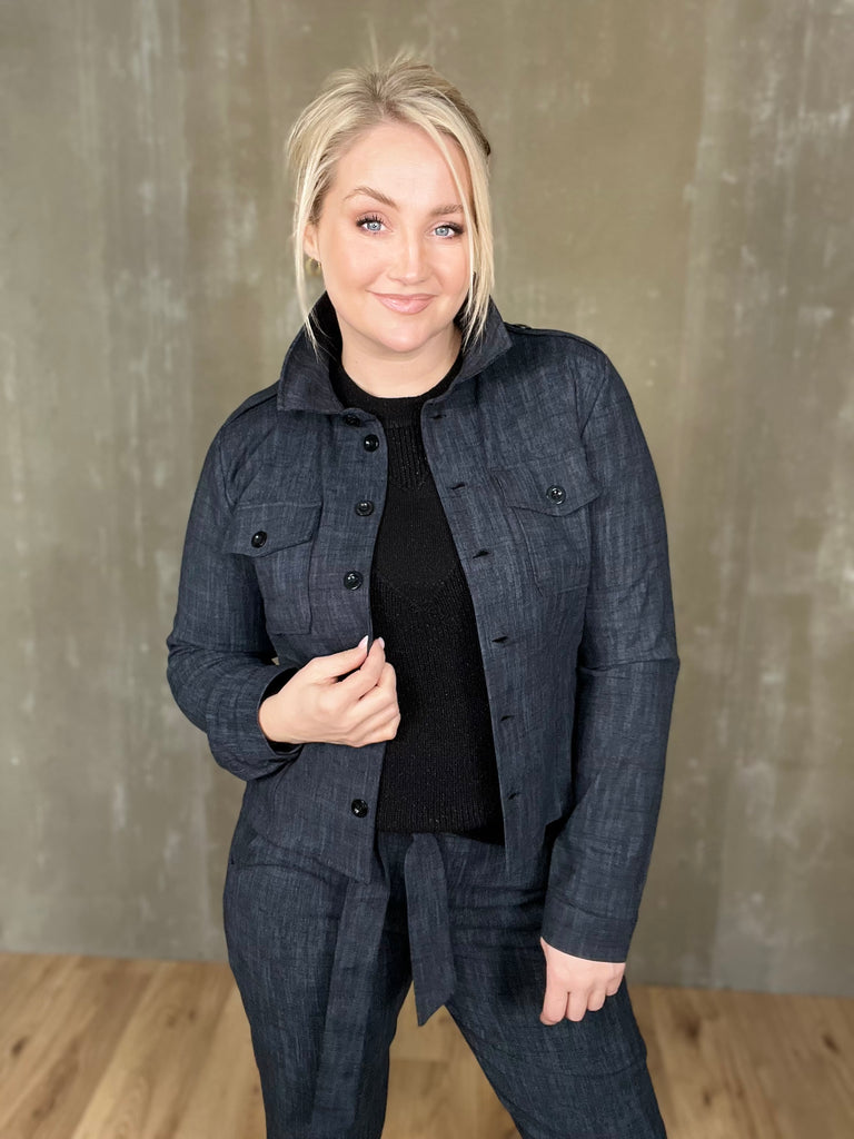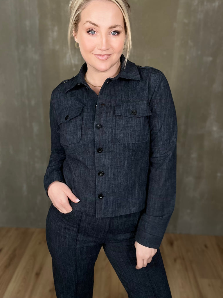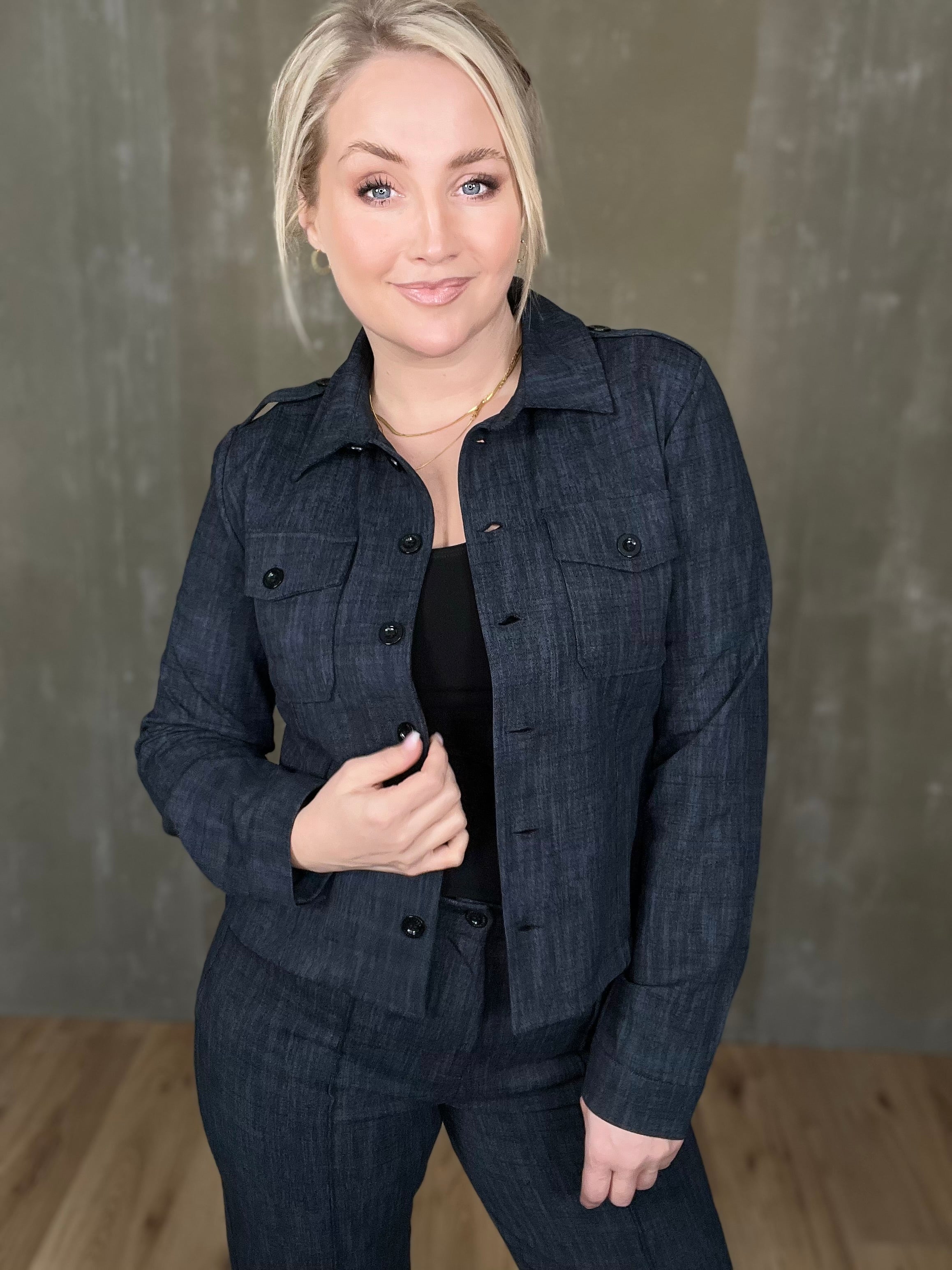 Milou jakkinn er úr sterku efni, með svörtum tölum og tveimur brjóstvösum. Hann passar einstaklega vel við Megan buxurnar fyrir fullkomið “complete outfit”! Töffaralegur efri partur sem eiginlega mitt á milli þess að vera skyrta og buxur. Bæði smart hafður opinn sem og lokaður.