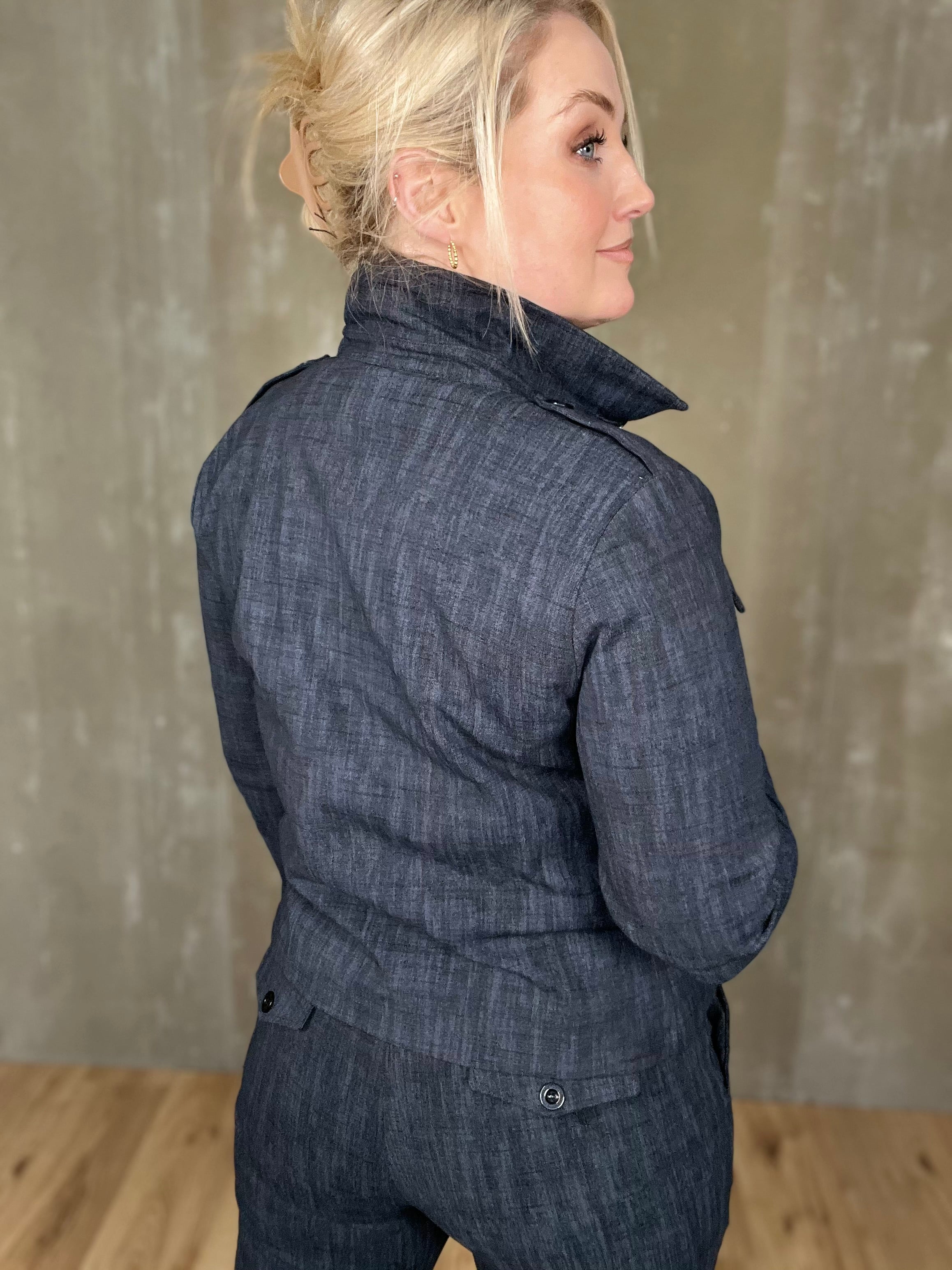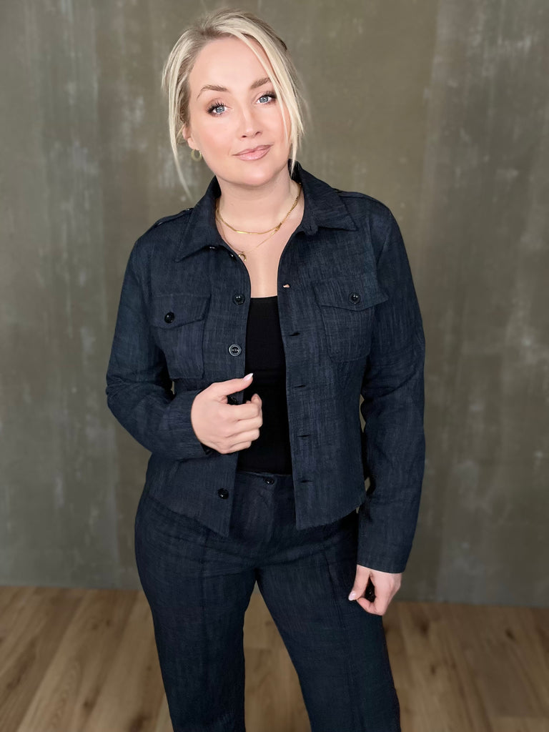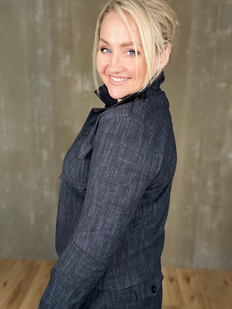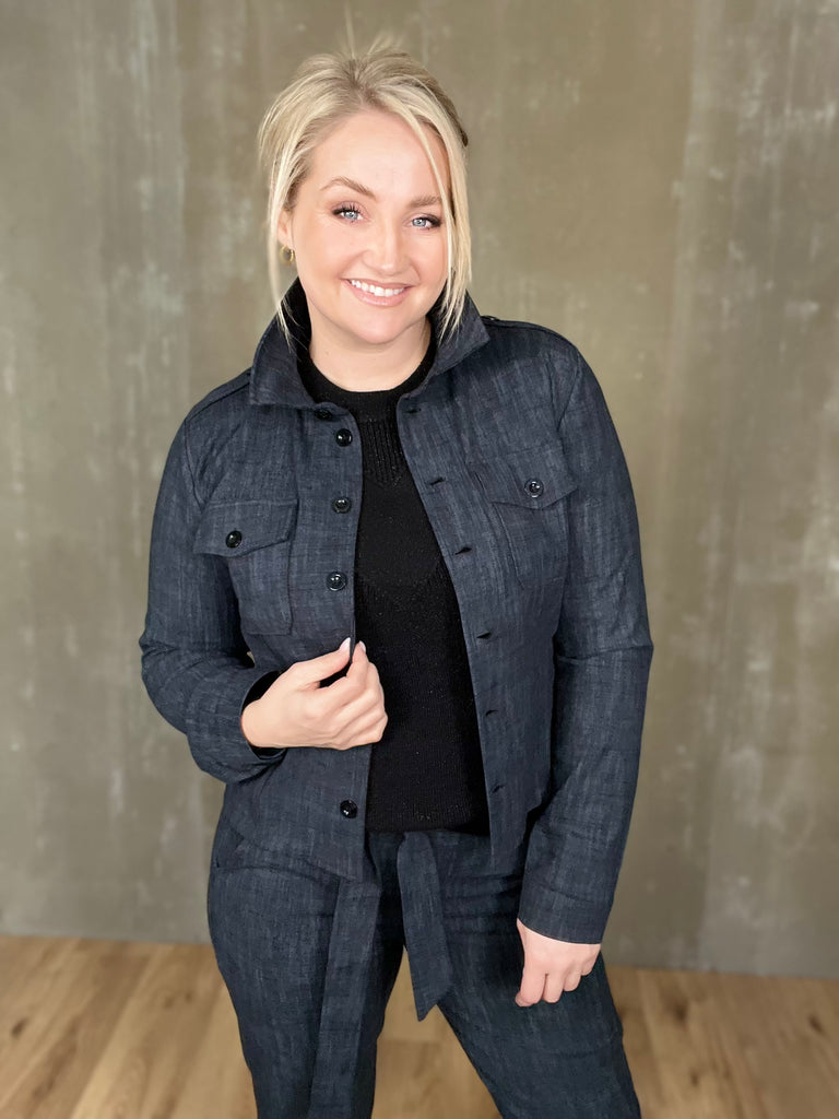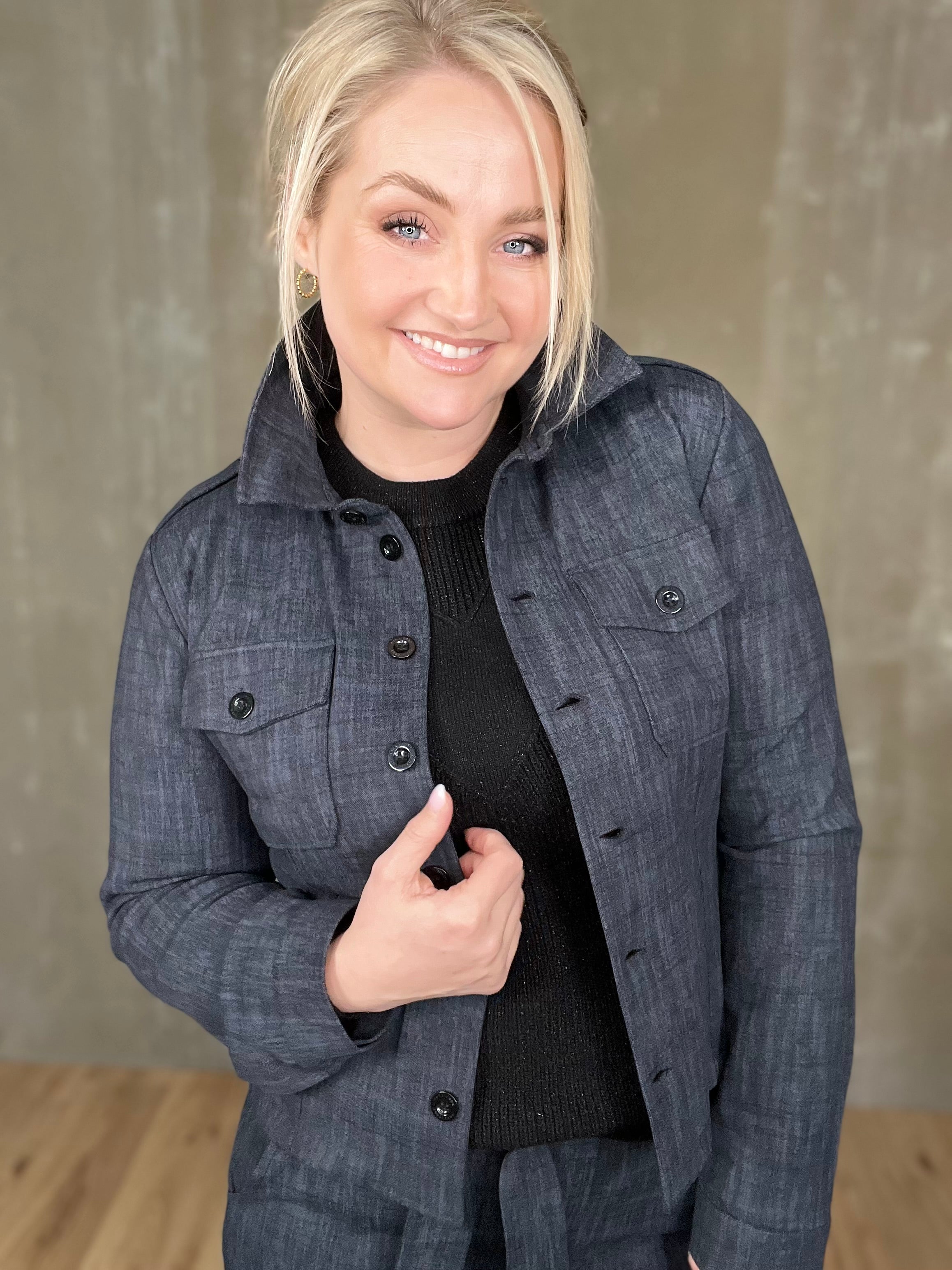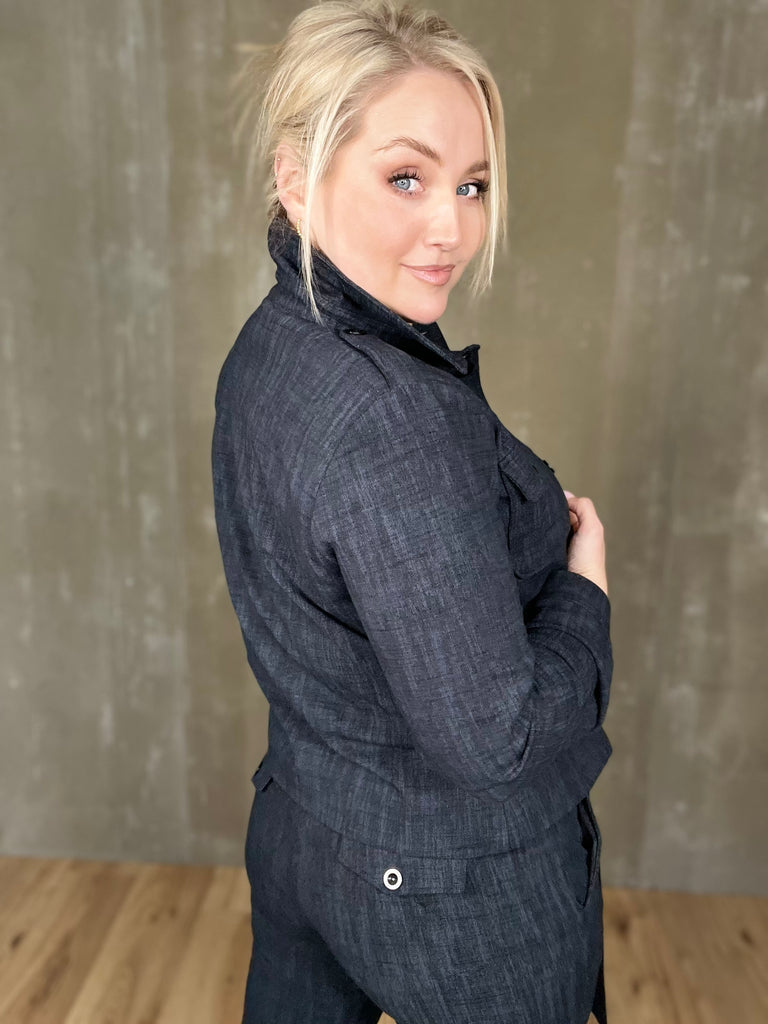 Milou jakkinn er úr sterku efni, með svörtum tölum og tveimur brjóstvösum. Hann passar einstaklega vel við Megan buxurnar fyrir fullkomið “complete outfit”! Töffaralegur efri partur sem eiginlega mitt á milli þess að vera skyrta og buxur. Bæði smart hafður opinn sem og lokaður.