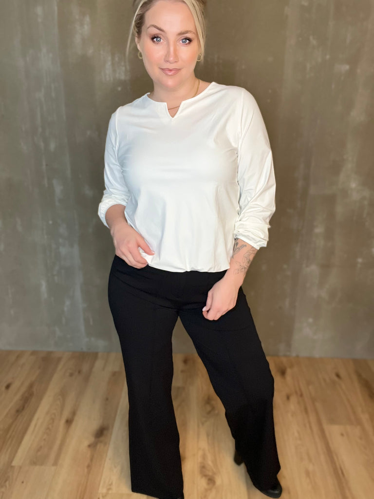 Miriam Wide Leg buxur eru algerar lykilbuxur í fataskápnum. Þær eru einstaklega þægilegar og passa frábærlega við bæði jakka, prjónaflíkur, skyrtur og toppa. Þessar buxur tryggja fullkomið snið og mikla þægindi. Sjá má þær stílaðar á myndunum hér fyrir neðan. Módelið okkar er 173 cm á hæð og klæðist stærð L