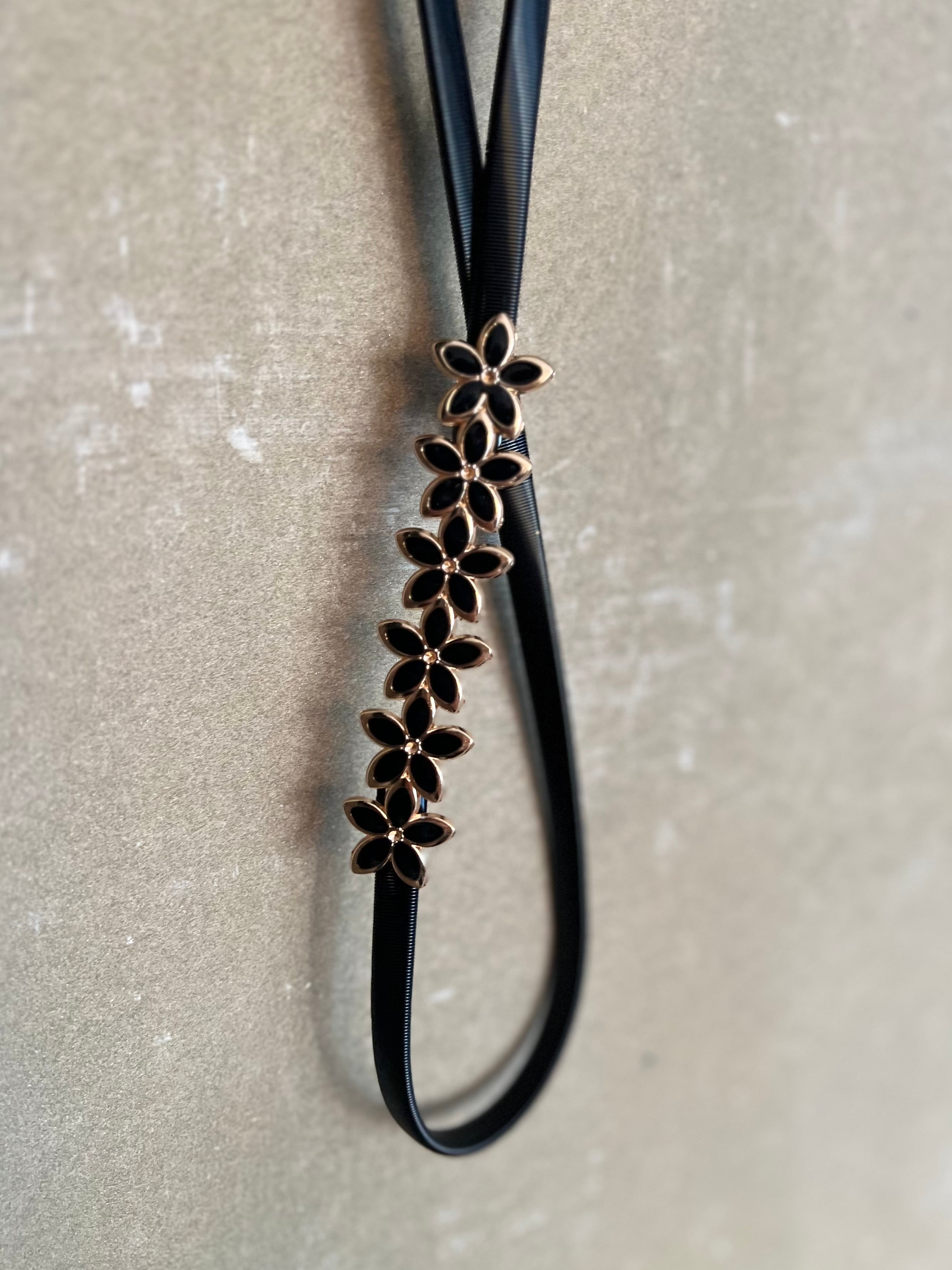 Mjó gormabelti sem teygjast með krækju sem festir. Fínlegt en skemmtileg belti.