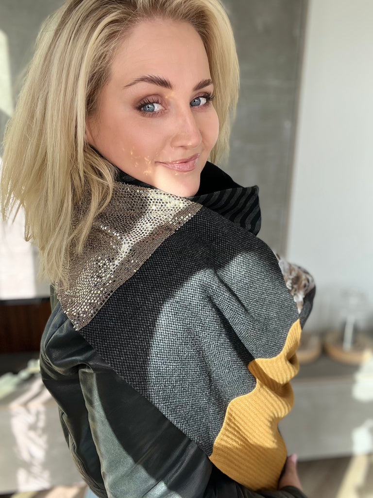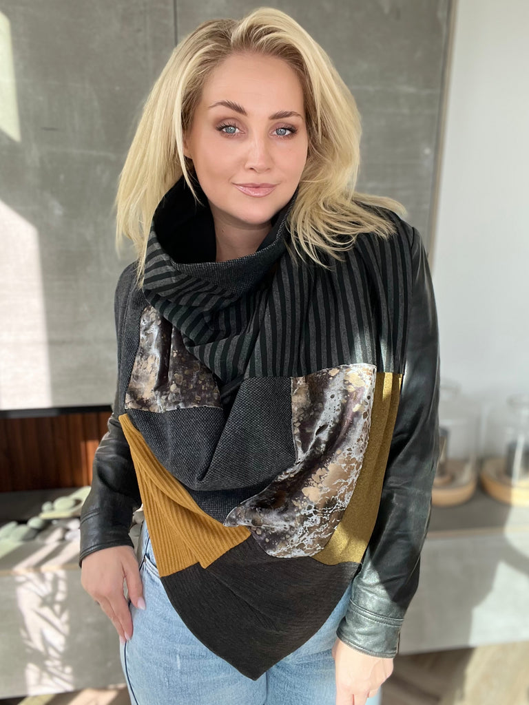 Úr varð því einskonar búta hulsa eða hálskragi sem einnig er hægt að nota sem sjal með því að draga það aðeins niður á axlir.