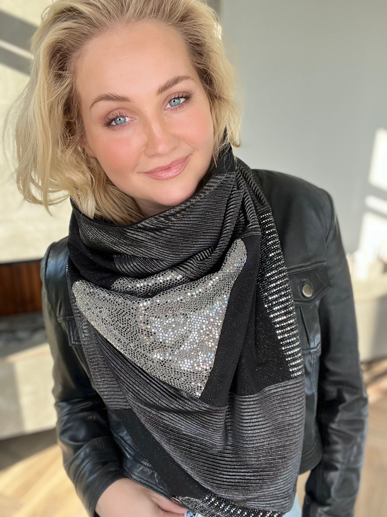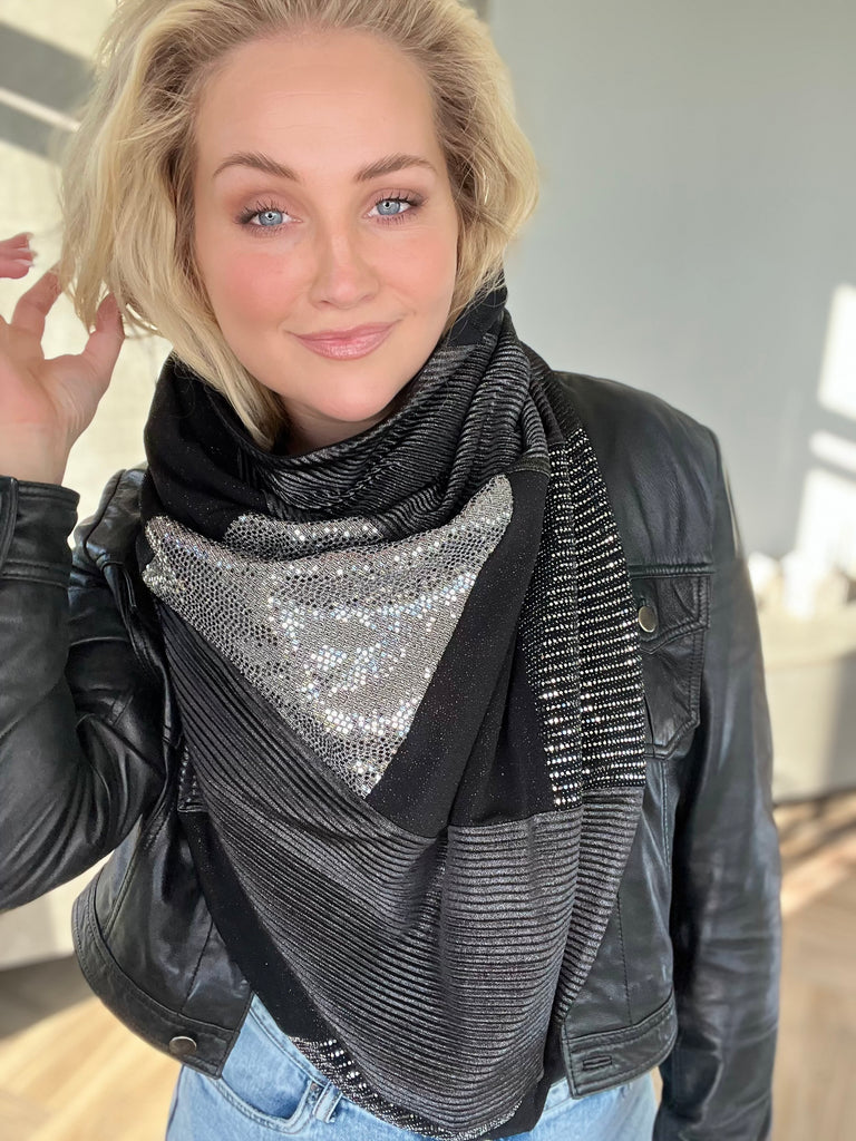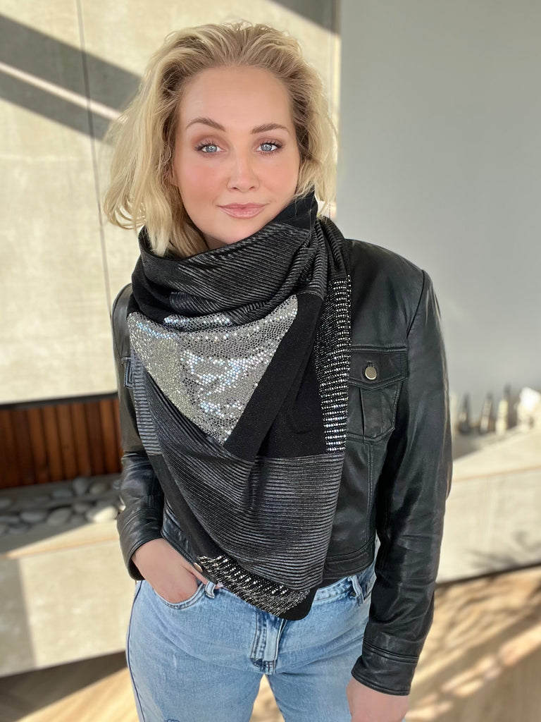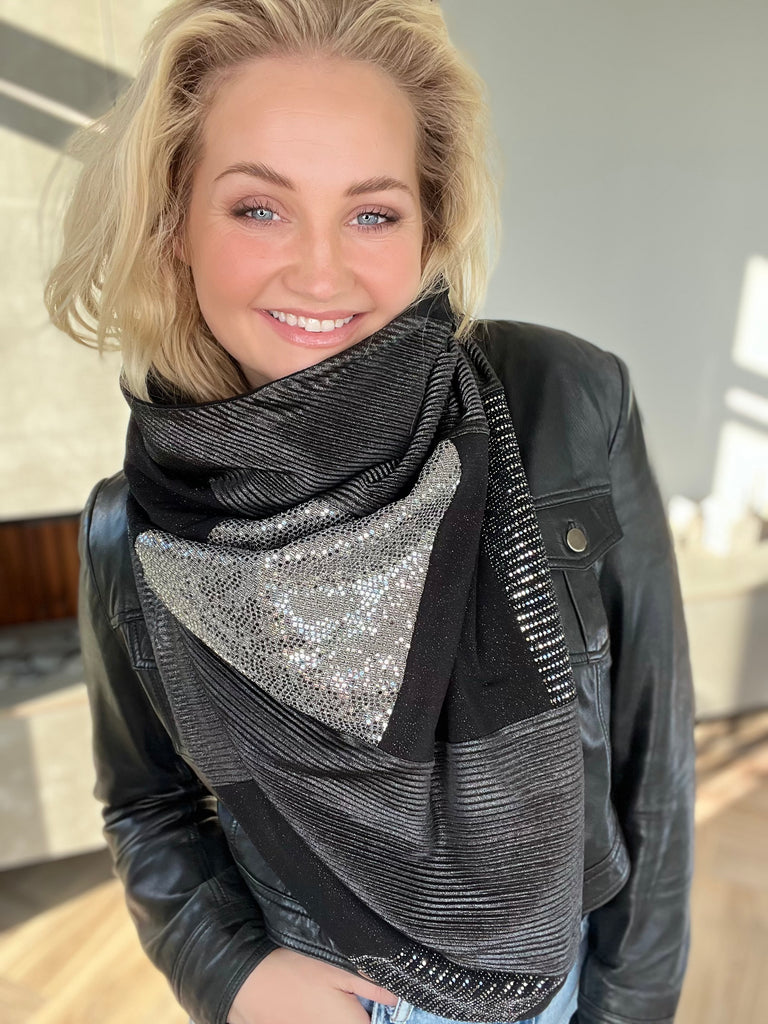 Úr varð því einskonar búta hulsa eða hálskragi sem einnig er hægt að nota sem sjal með því að draga það aðeins niður á axlir.