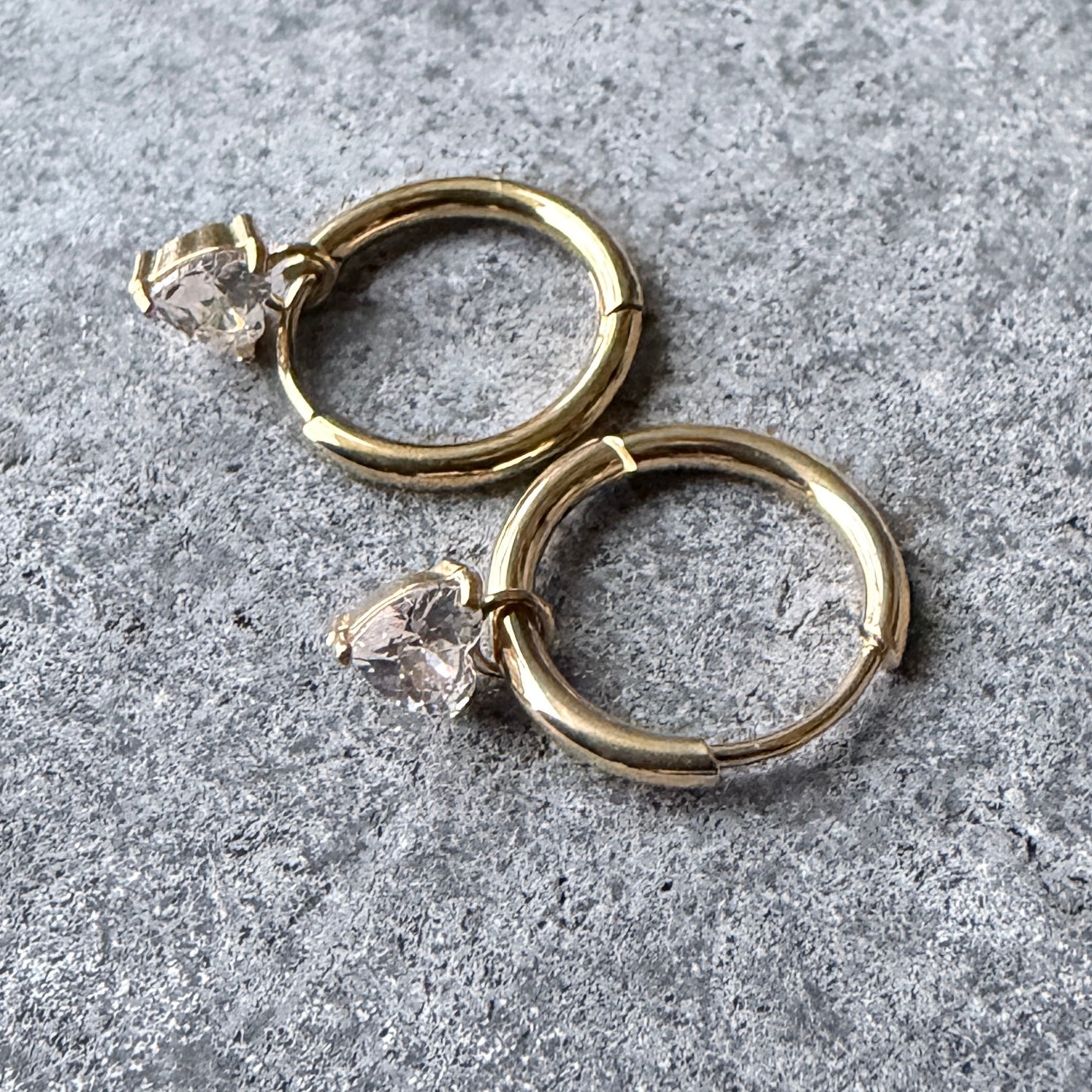 Lokkar úr ryðfríu stáli, um 1 cm í þvermál, fallegur hjartalaga steinn hangir í hring. Mjög penir og léttir, gætu hentað fyrir yngri dömurnar líka.