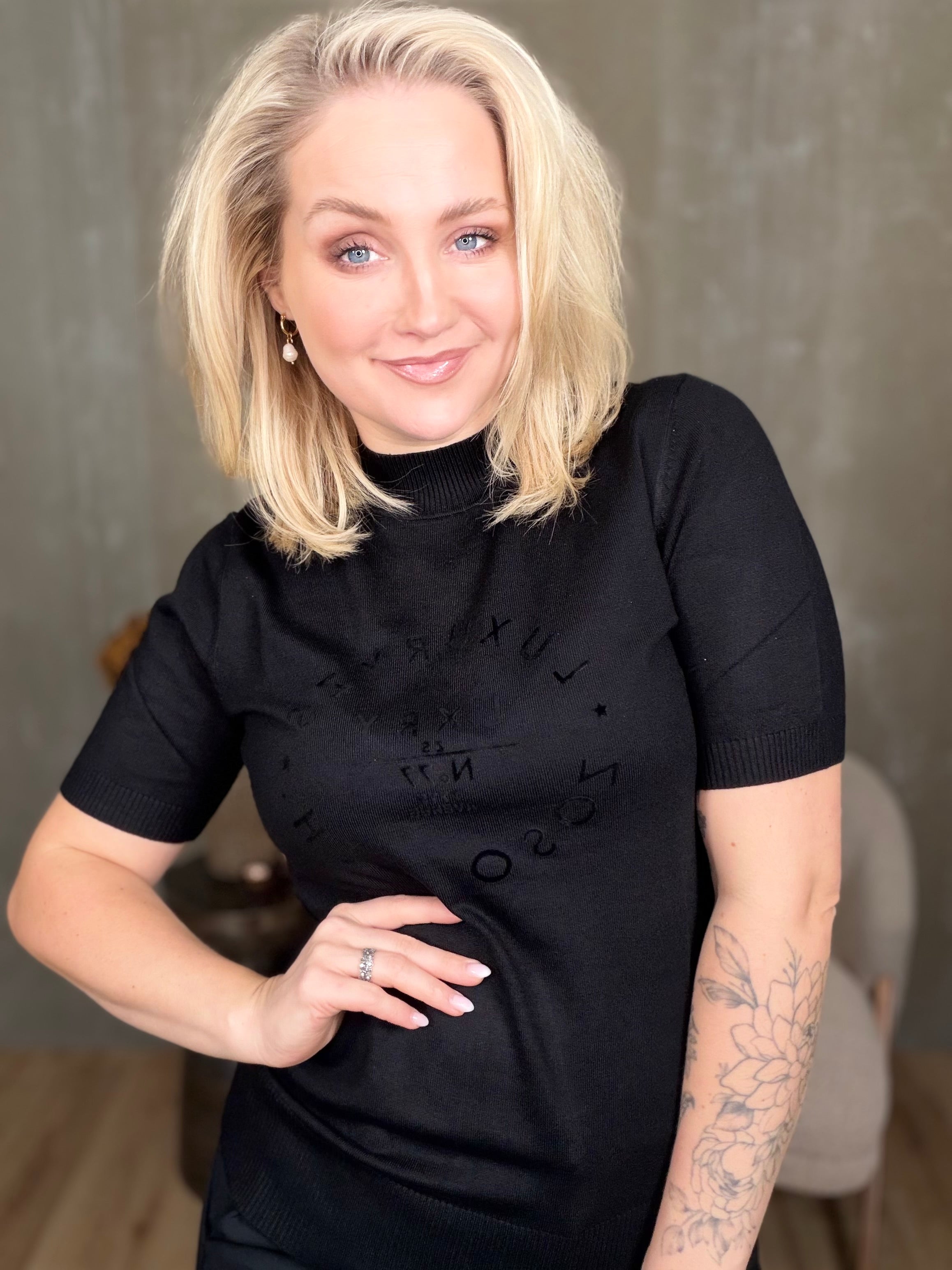 Rebecca toppurinn er úr fallegu og einstaklega mjúku prjónuðu viscose efni með léttu prenti að framan. Nær upp í háls með stuttum ermum. Þessi er sporty og fallegur undir blazer.