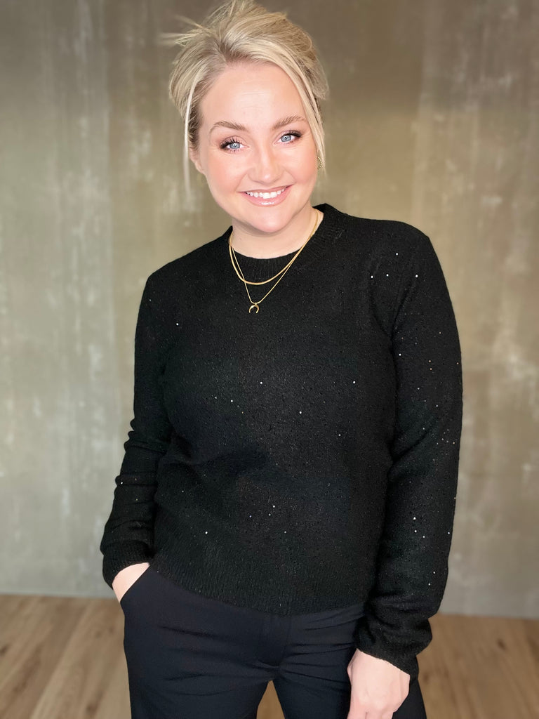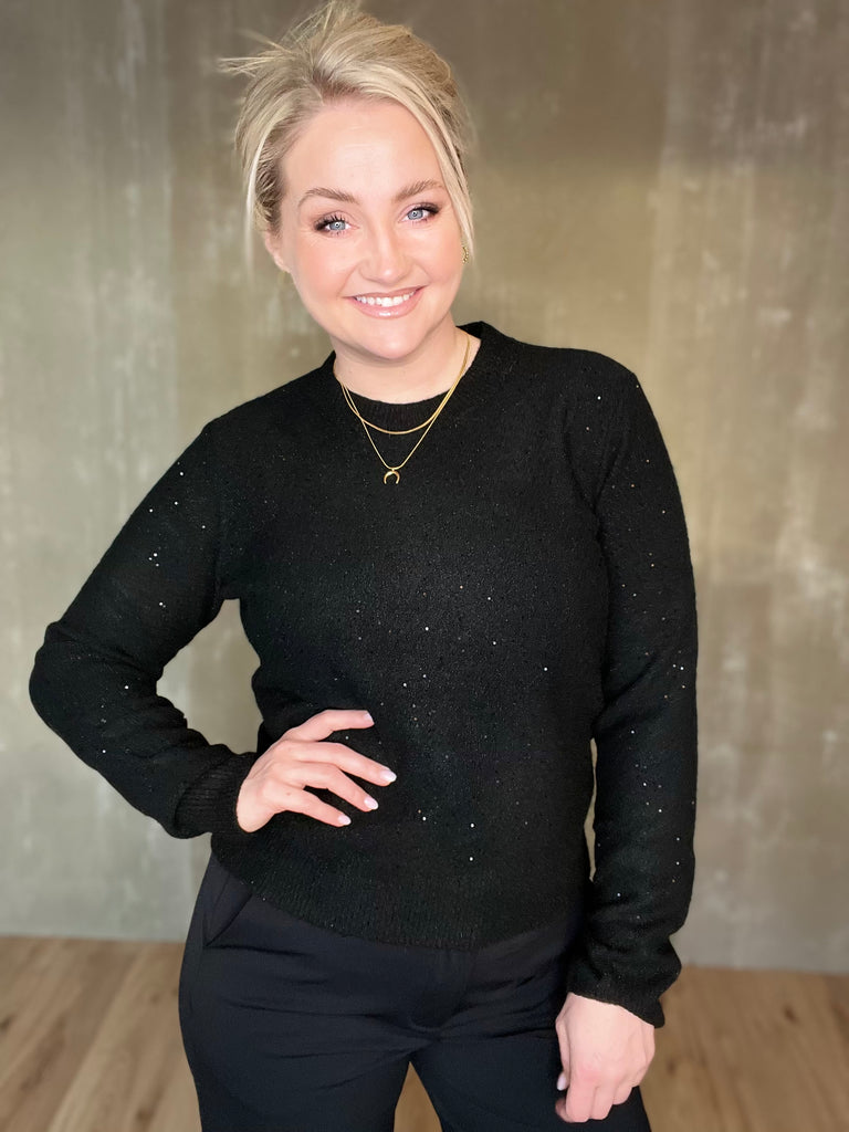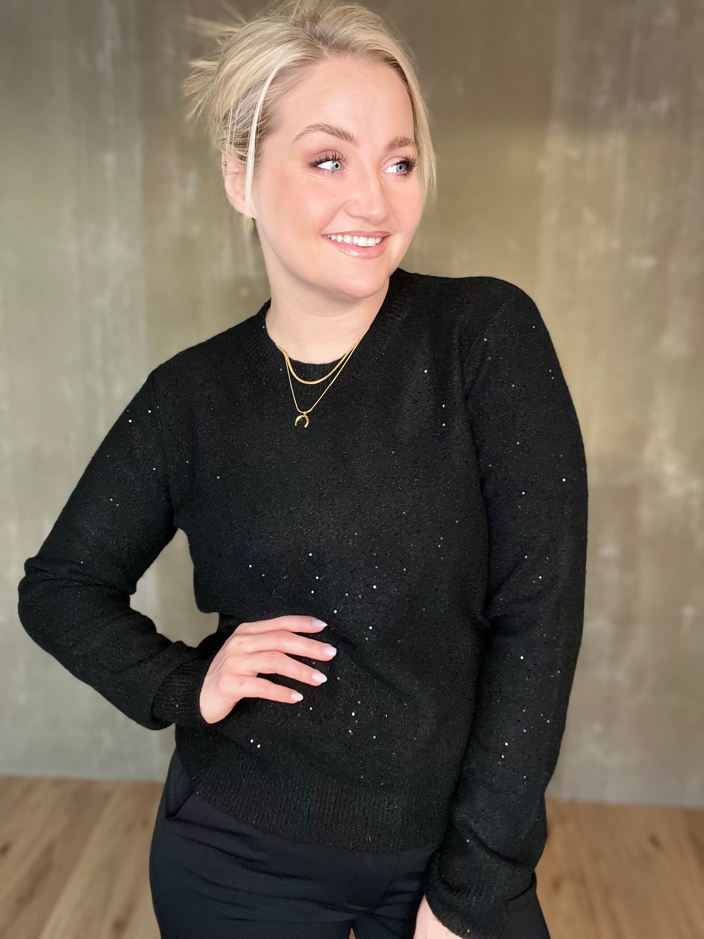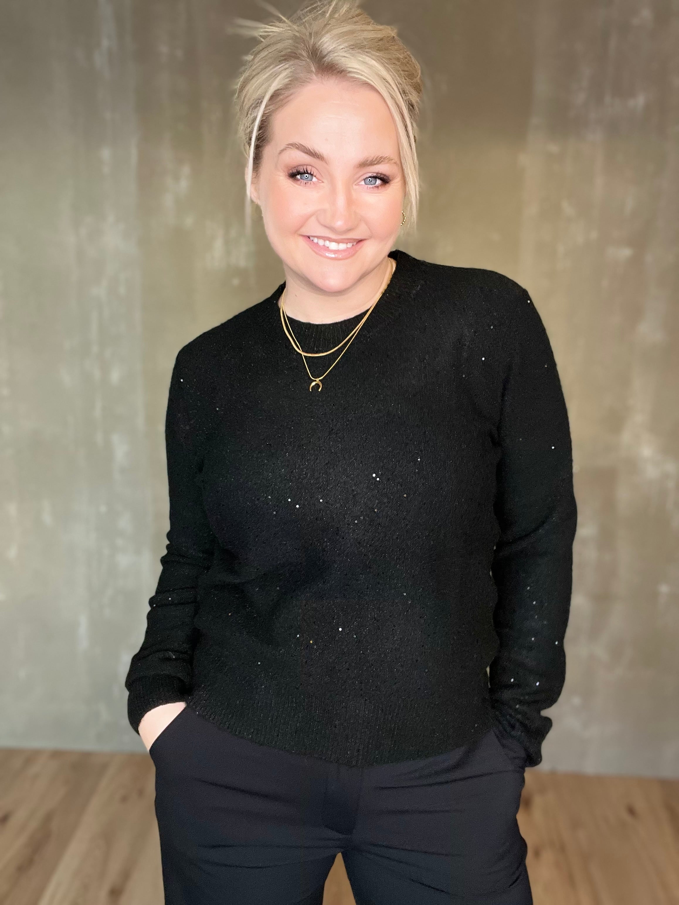 Sparileg og sæt peysa með pallíettum. Þessi er svo ferlega notaleg og getur svo auðveldlega verið notuð spari. Fallegt rúnað hálsmál, klæðileg, klassísk og mjúk. Fyrir allra viðkvæmustu er rétt að benda á að hún klæjar oggu oggu pons enda 5% ull.