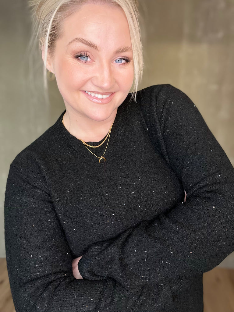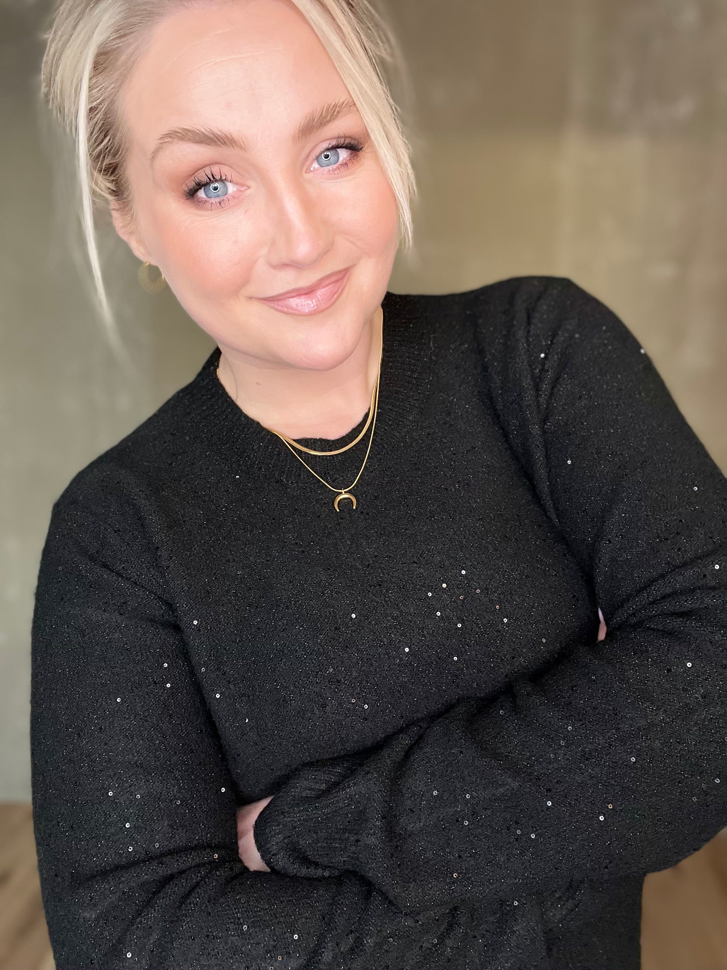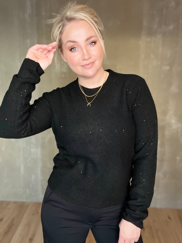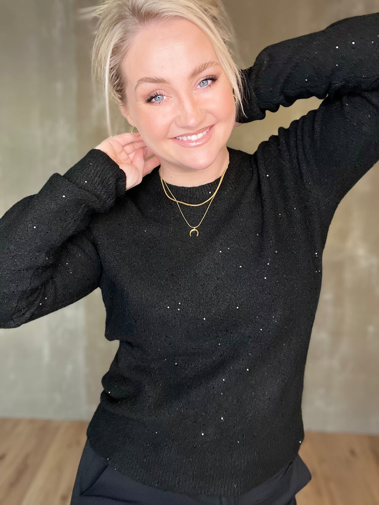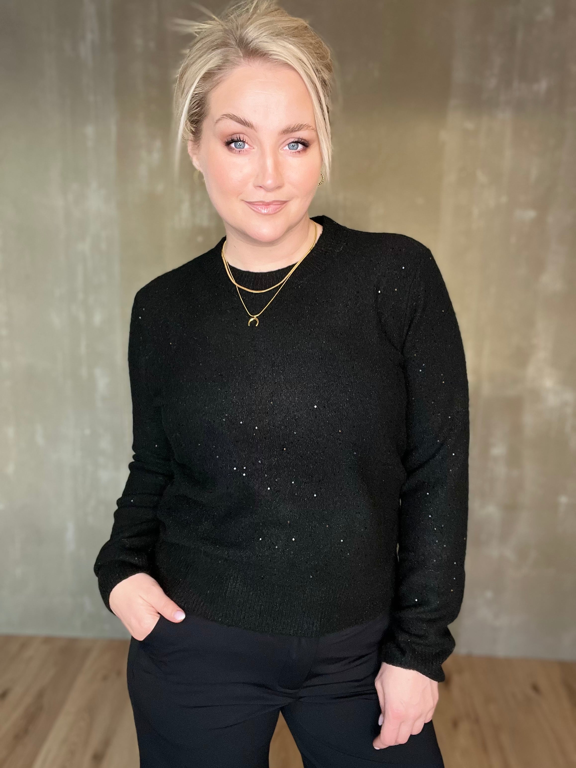 Sparileg og sæt peysa með pallíettum. Þessi er svo ferlega notaleg og getur svo auðveldlega verið notuð spari. Fallegt rúnað hálsmál, klæðileg, klassísk og mjúk. Fyrir allra viðkvæmustu er rétt að benda á að hún klæjar oggu oggu pons enda 5% ull.