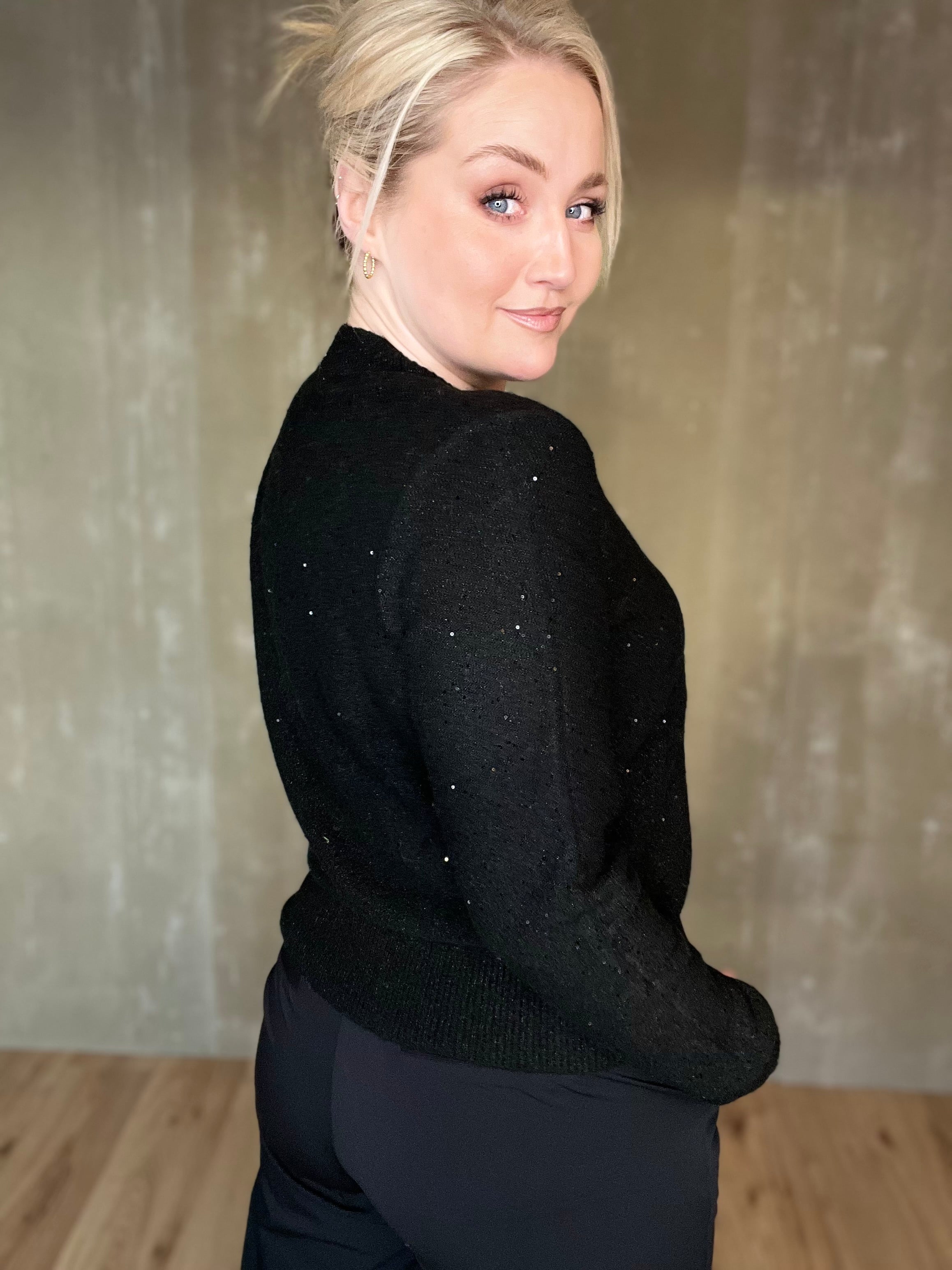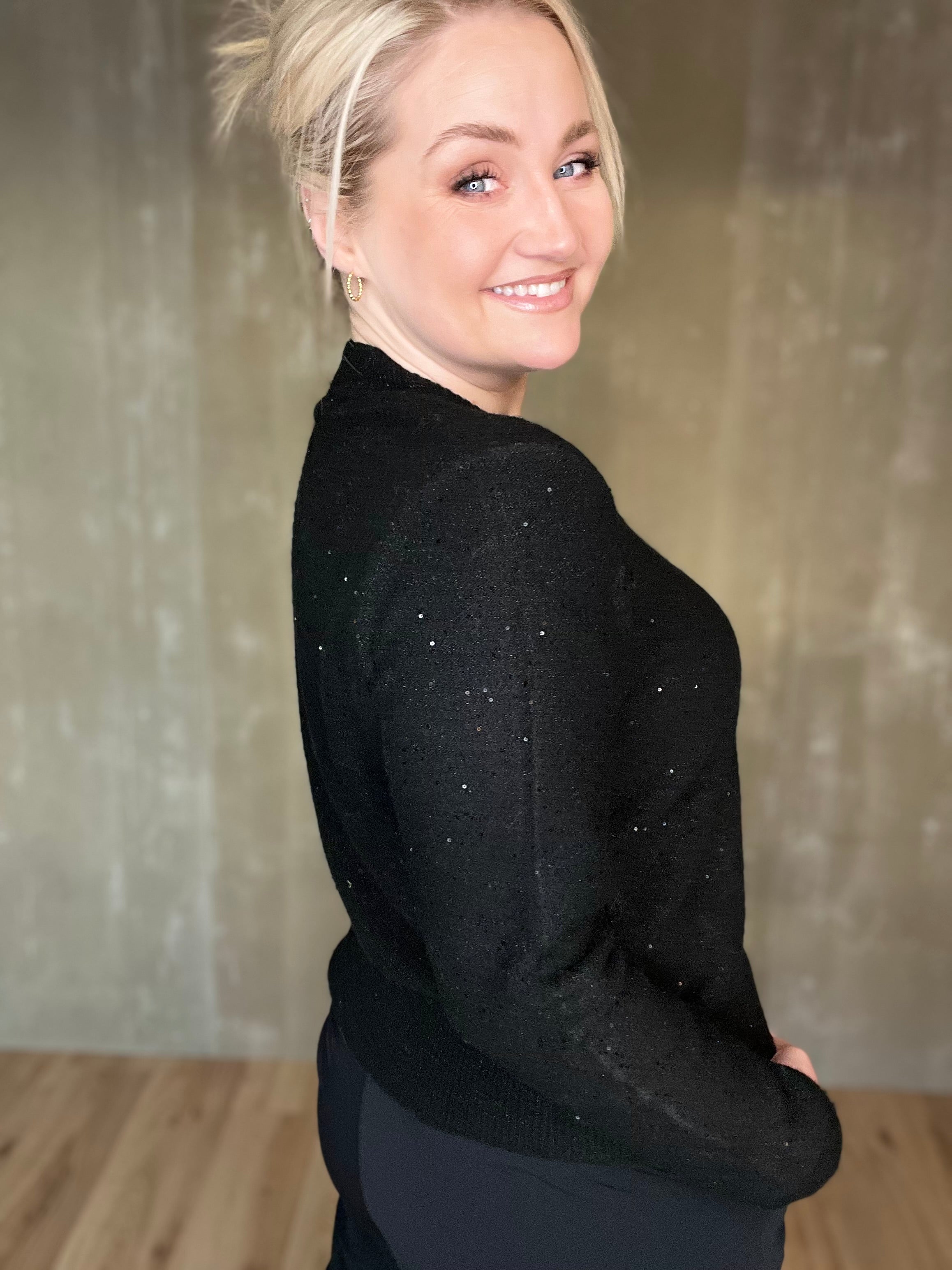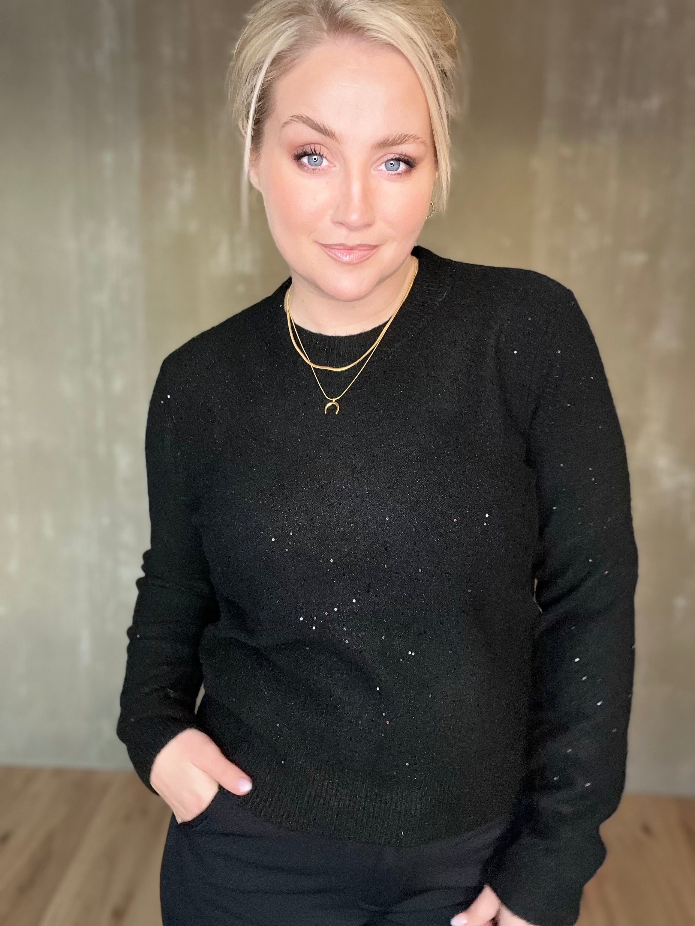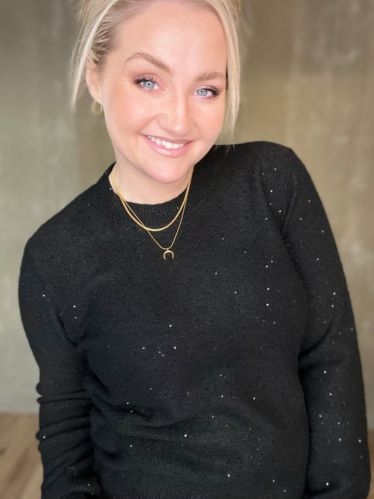 Sparileg og sæt peysa með pallíettum. Þessi er svo ferlega notaleg og getur svo auðveldlega verið notuð spari. Fallegt rúnað hálsmál, klæðileg, klassísk og mjúk. Fyrir allra viðkvæmustu er rétt að benda á að hún klæjar oggu oggu pons enda 5% ull.