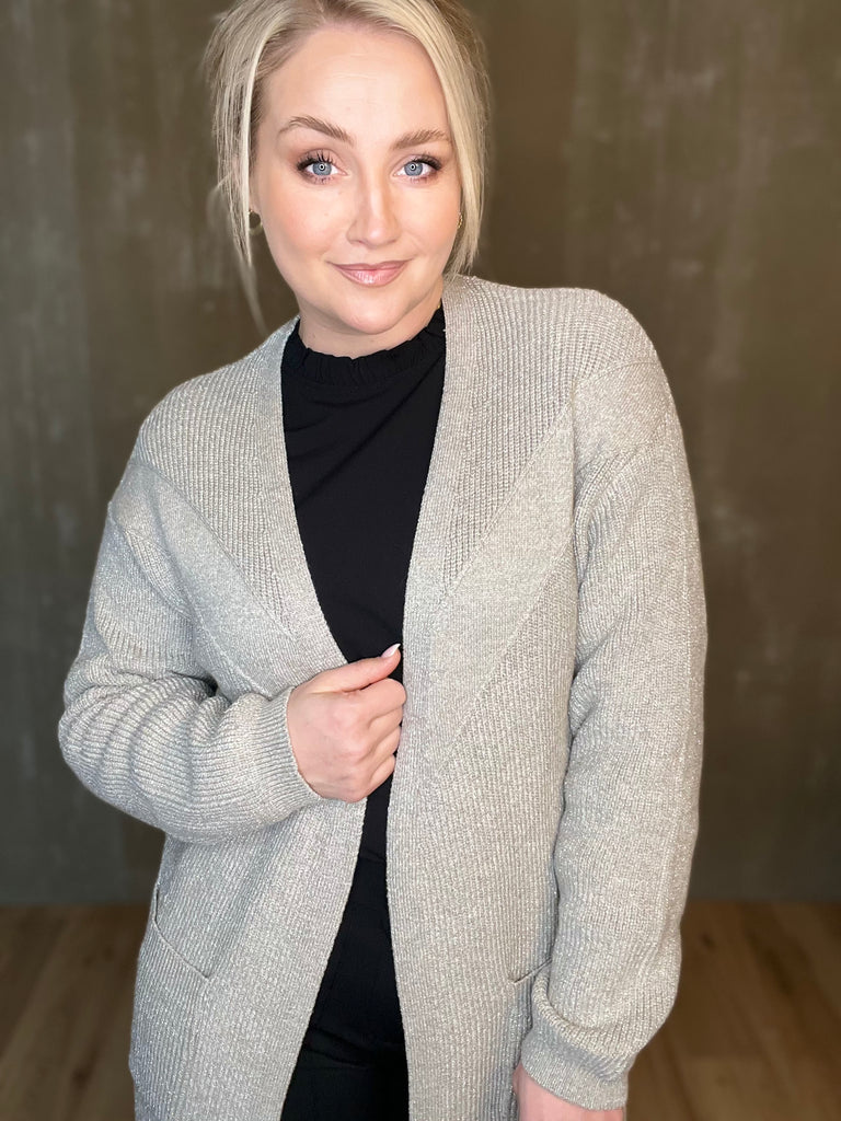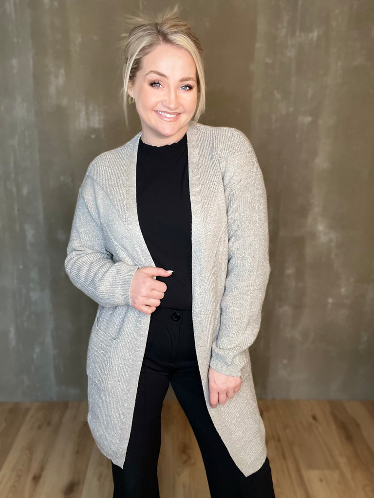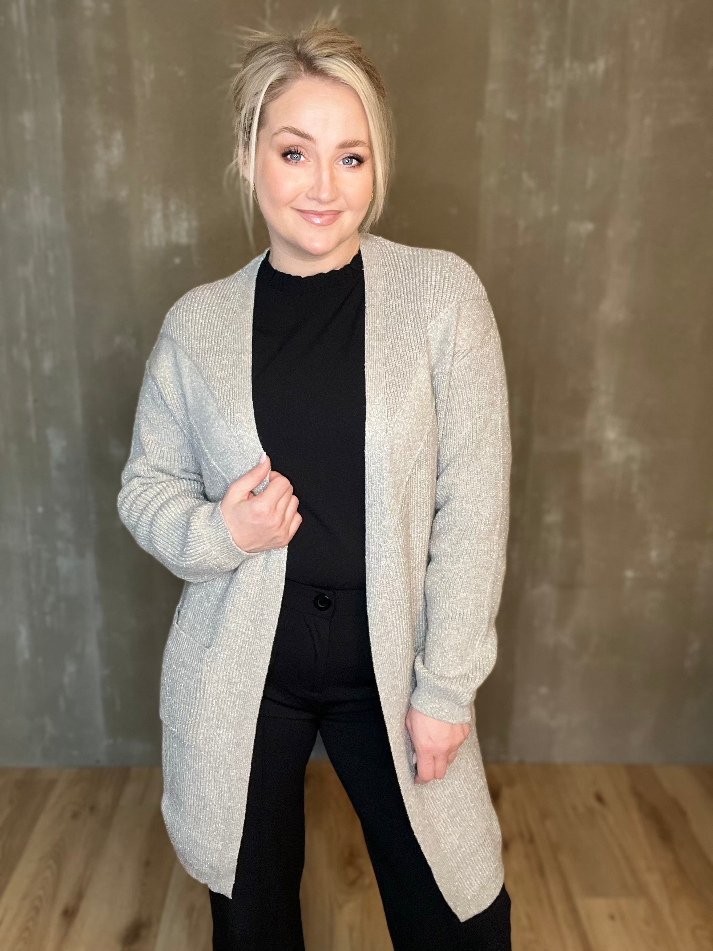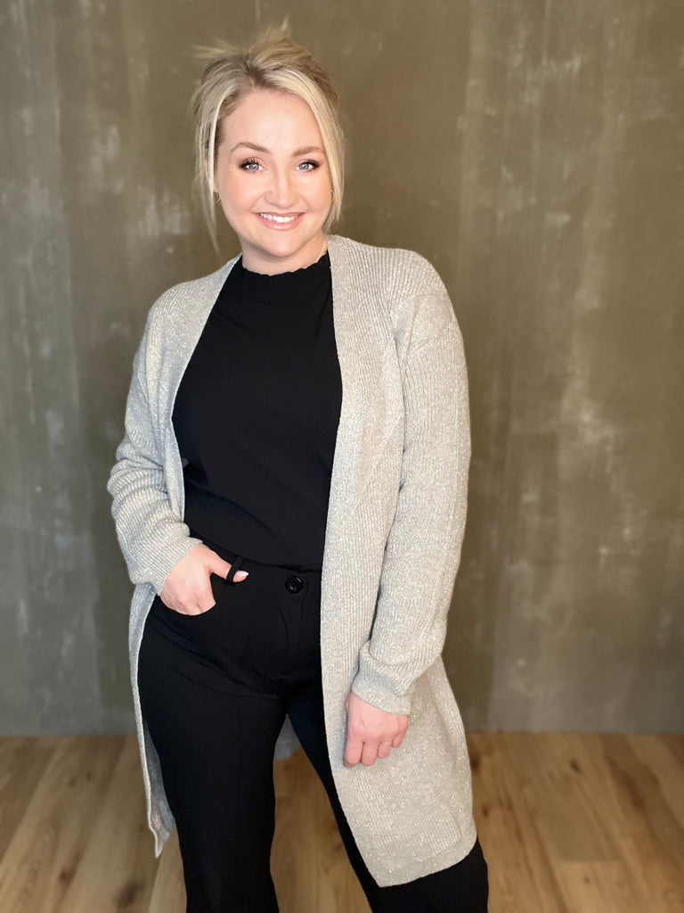Falleg opin prjónagolla frá Zoso! Stacey prjónapeysan er með fallegu prjóni, opin að framan, svolítið oversized og laus með víðum og fallegum ermum sem eru teknar saman í stroffi við úlnlið. og víðu, “oversized” sniði. Virkilega mjúk peysa með smá glitri. Þessi er líka með vösum að framan og er ofsa mjúk.