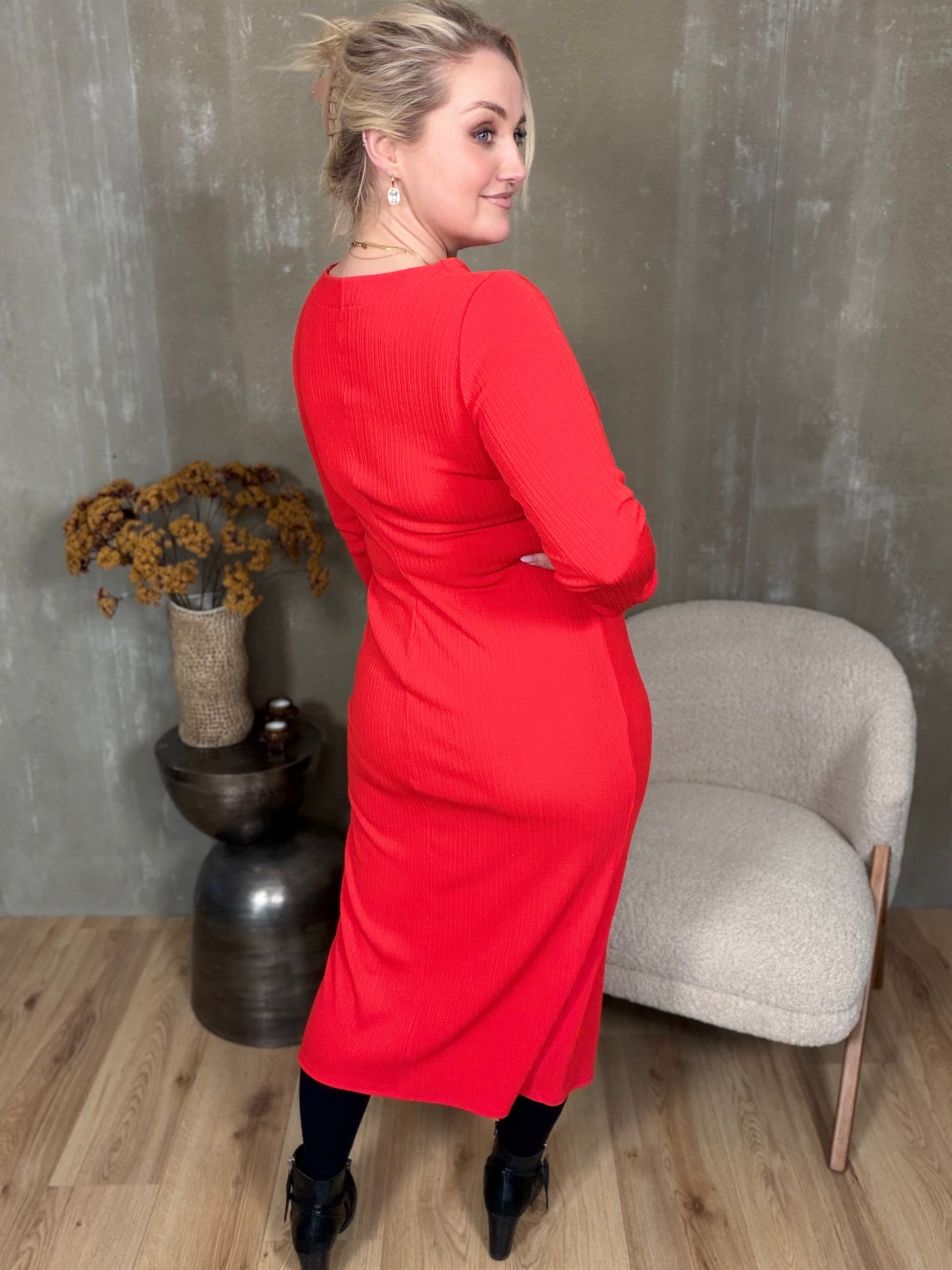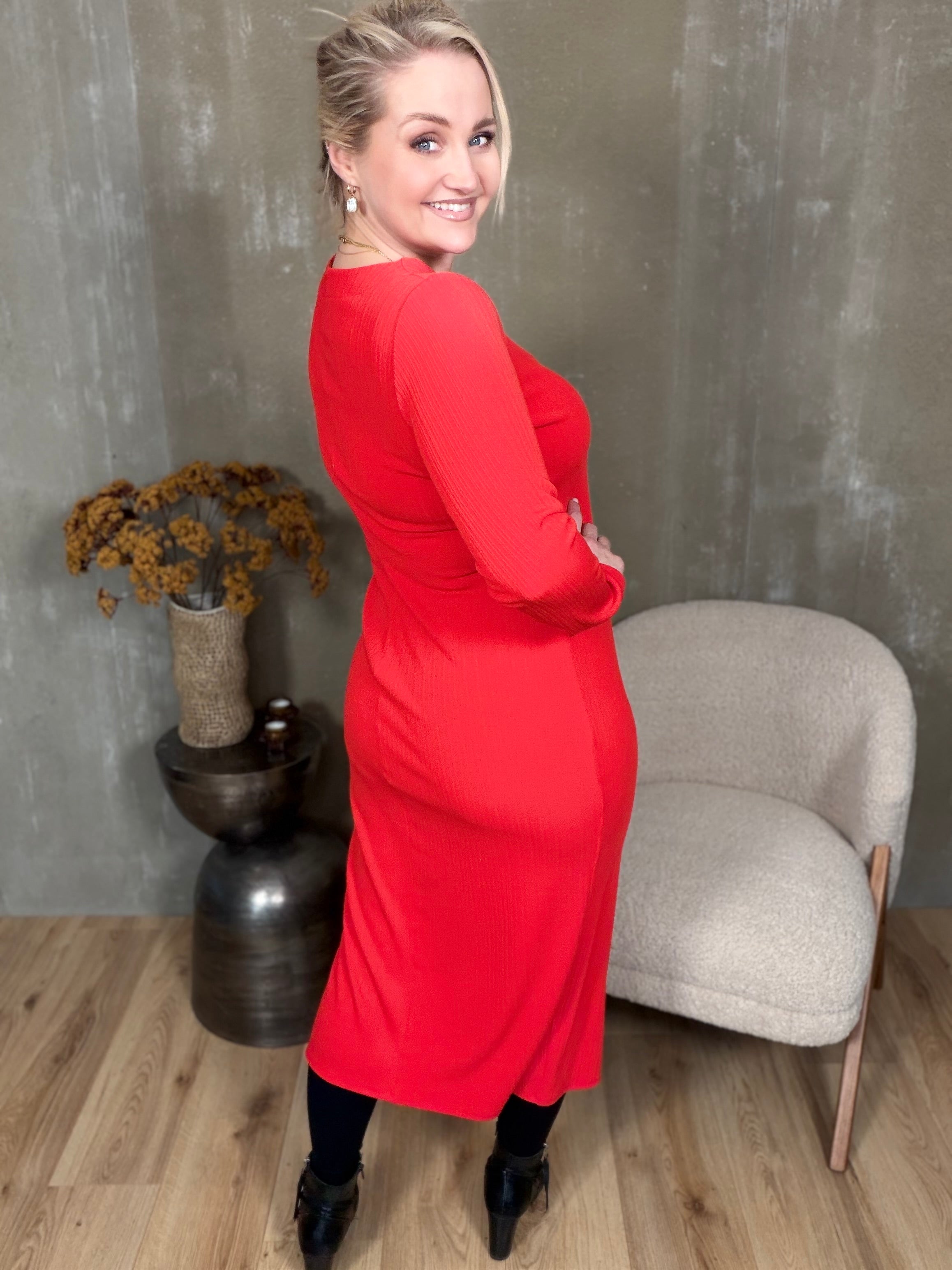 Strá kjóll er fallegur aðsniðinn kjóll sem nær vel niður fyrir hné og fallegu þveru hálsmáli með besetningu. Hann er með þröngum ermum en efnið er einstaklega fallegt með svolítilli áferð.