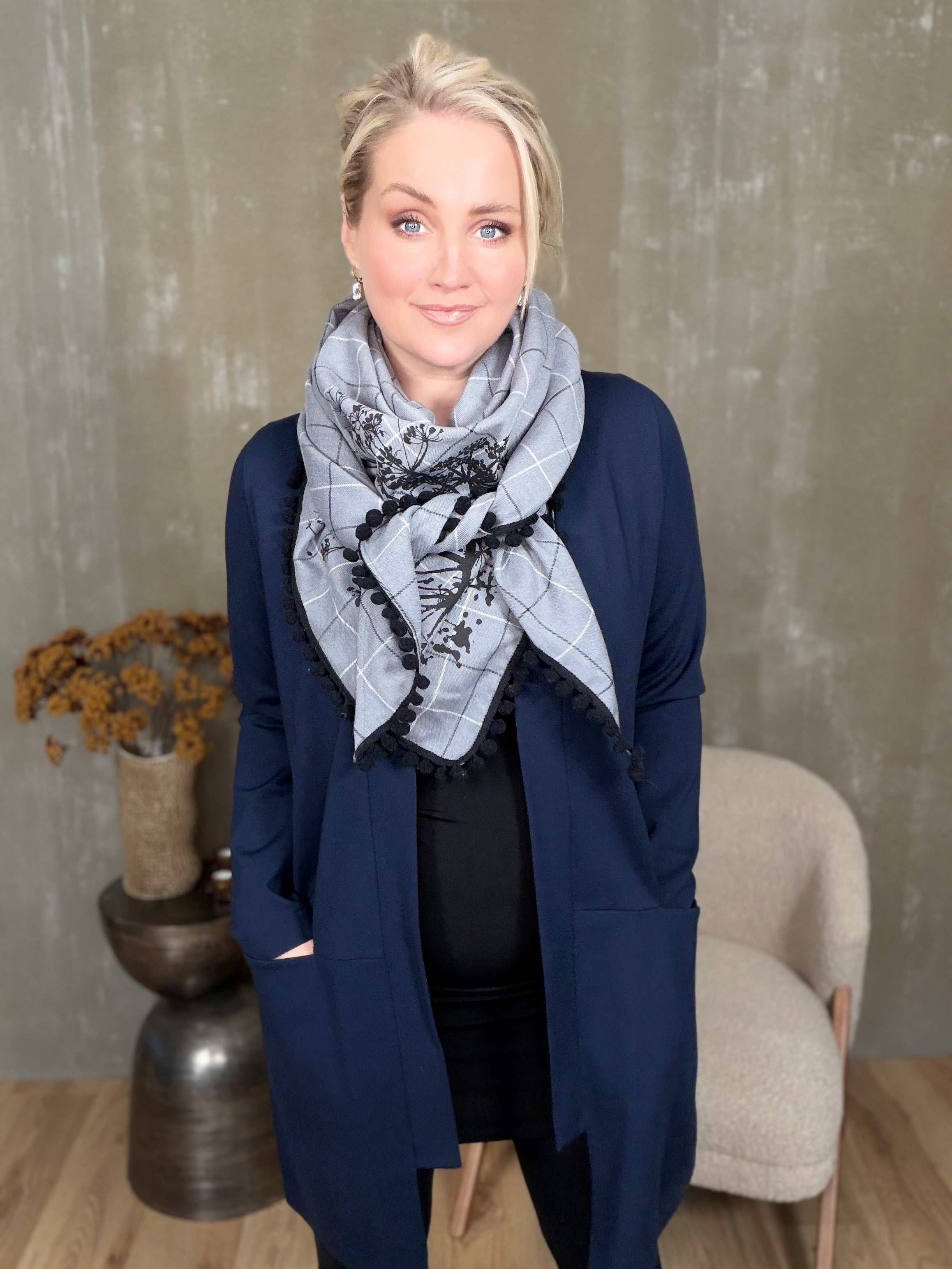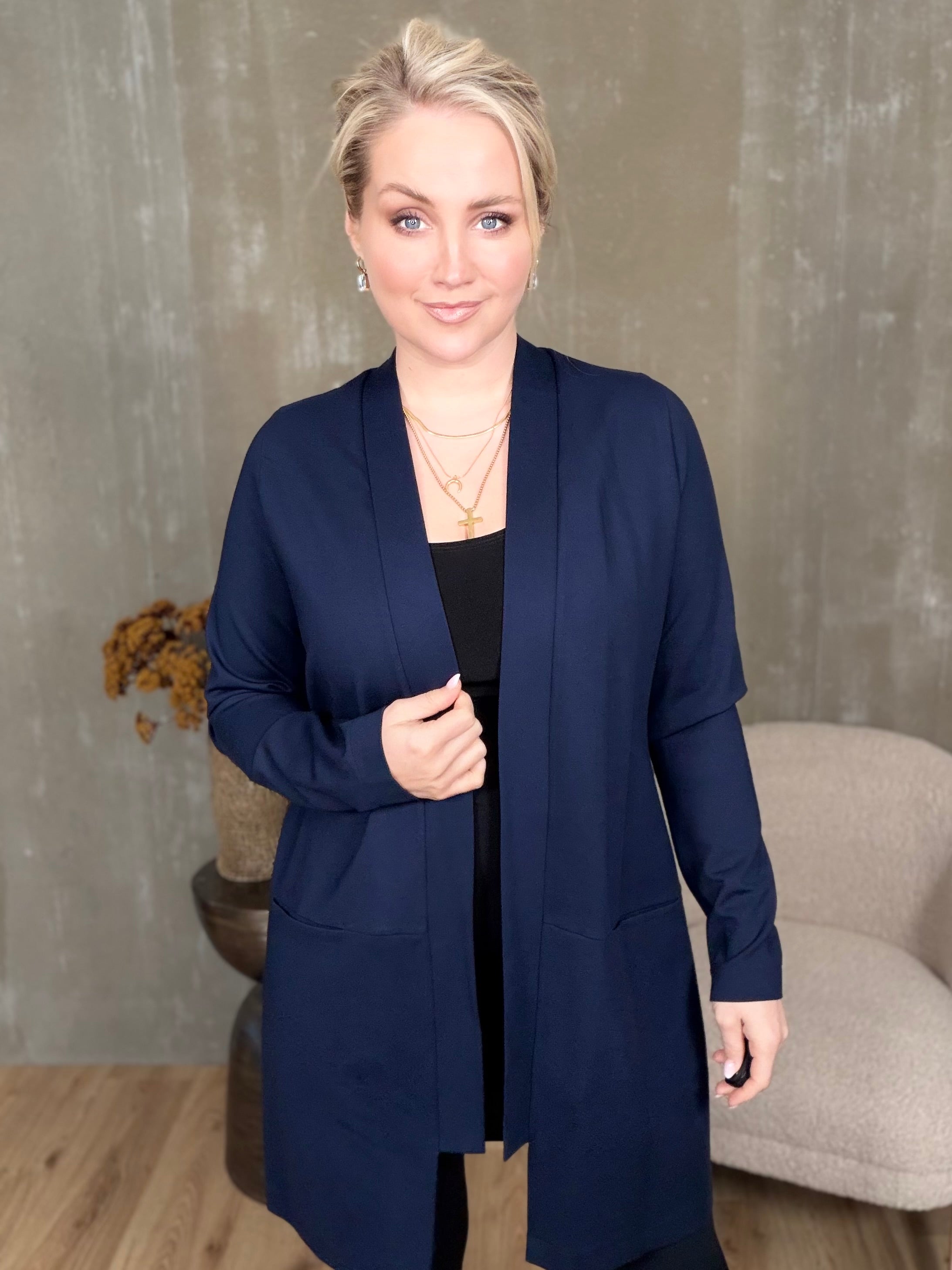 Þær henta sem utanyfirflíkur í léttara veðri en munu einnig koma sér mjög vel í vetur þegar það fer að kólna. Þær eru einfaldar í sniðinu með góðum ermum, opnar að framan með kanti sem rammar hálsmálið fallega og vösum sem falla niður í saum að framan.