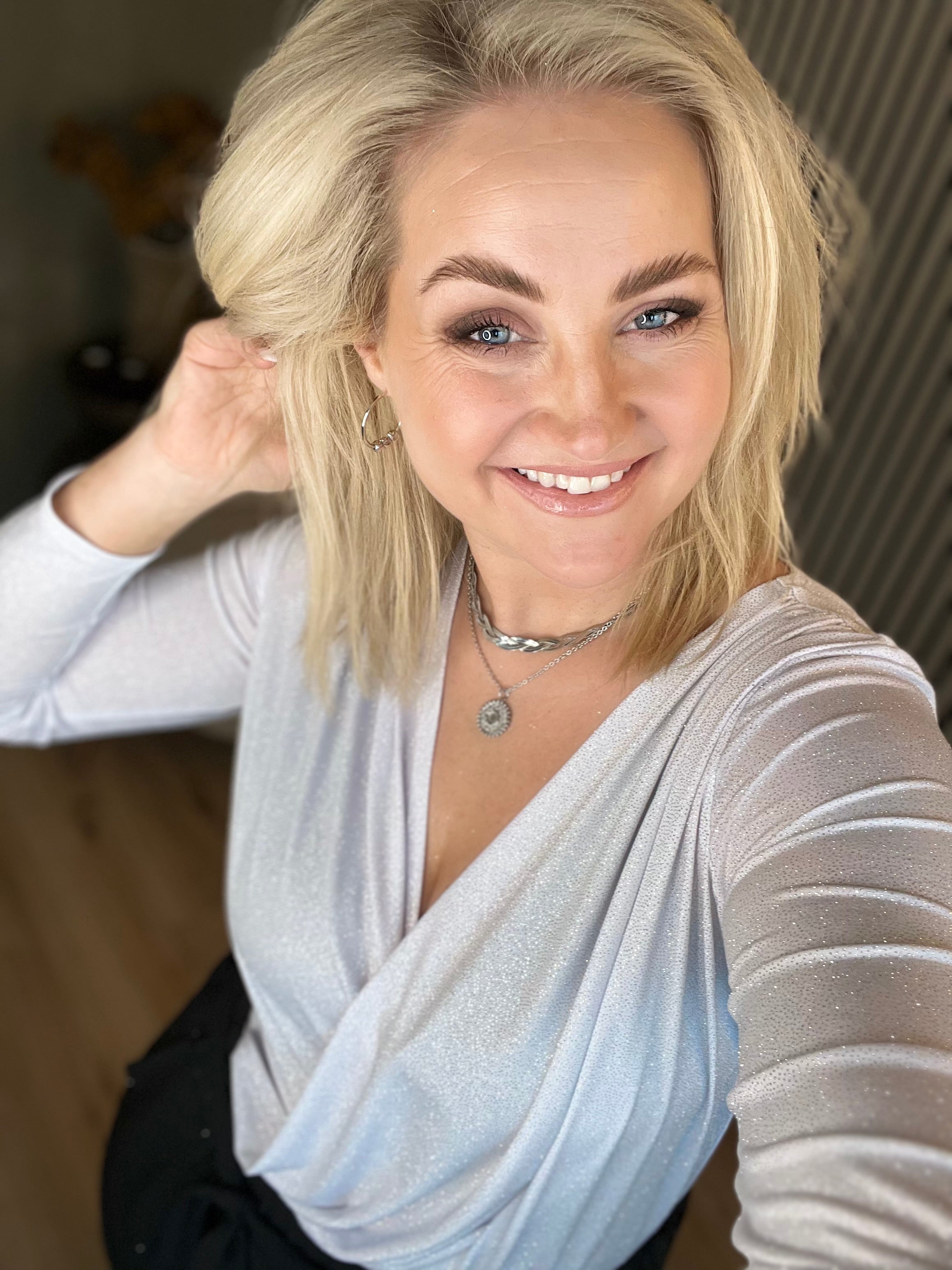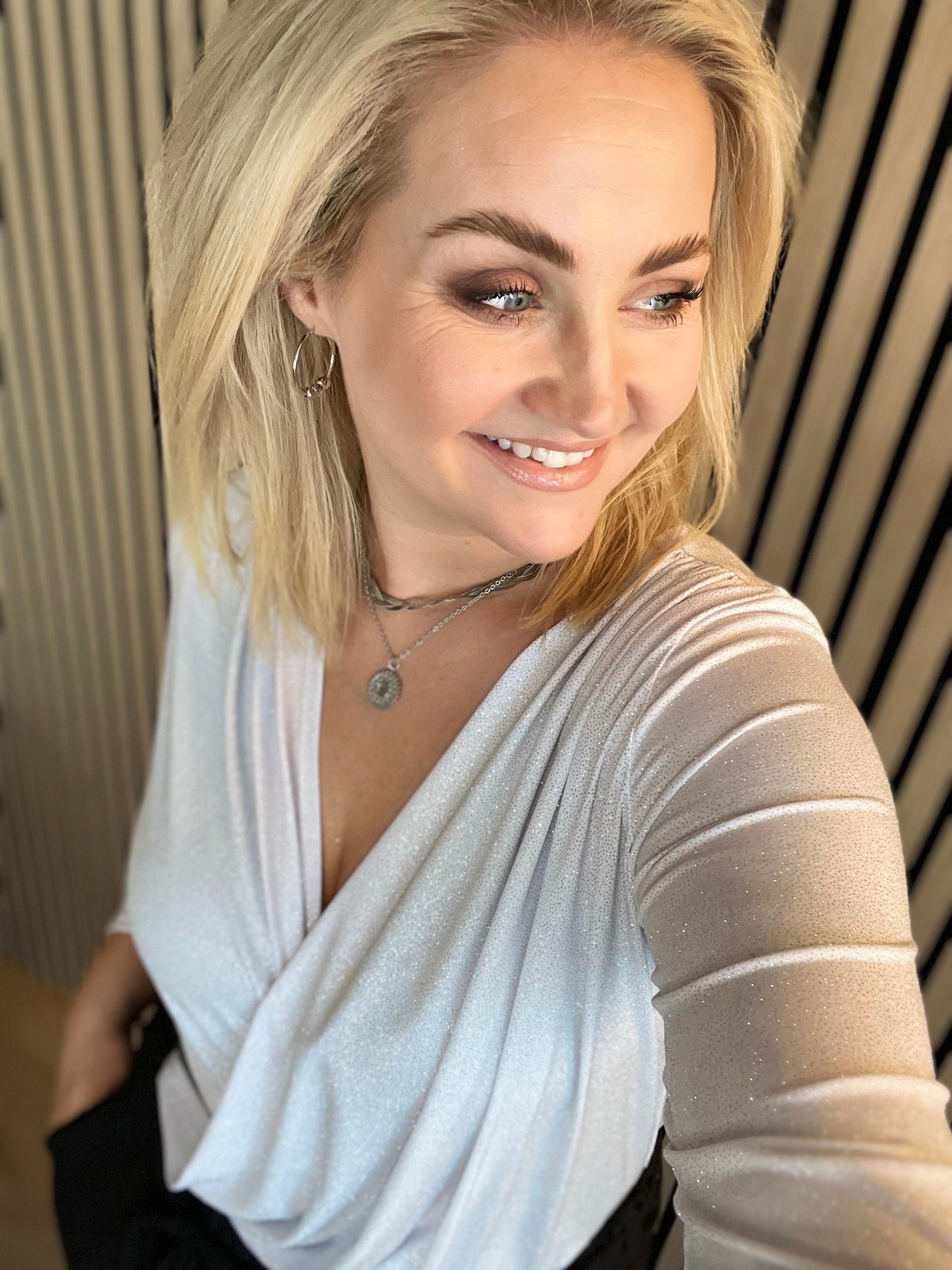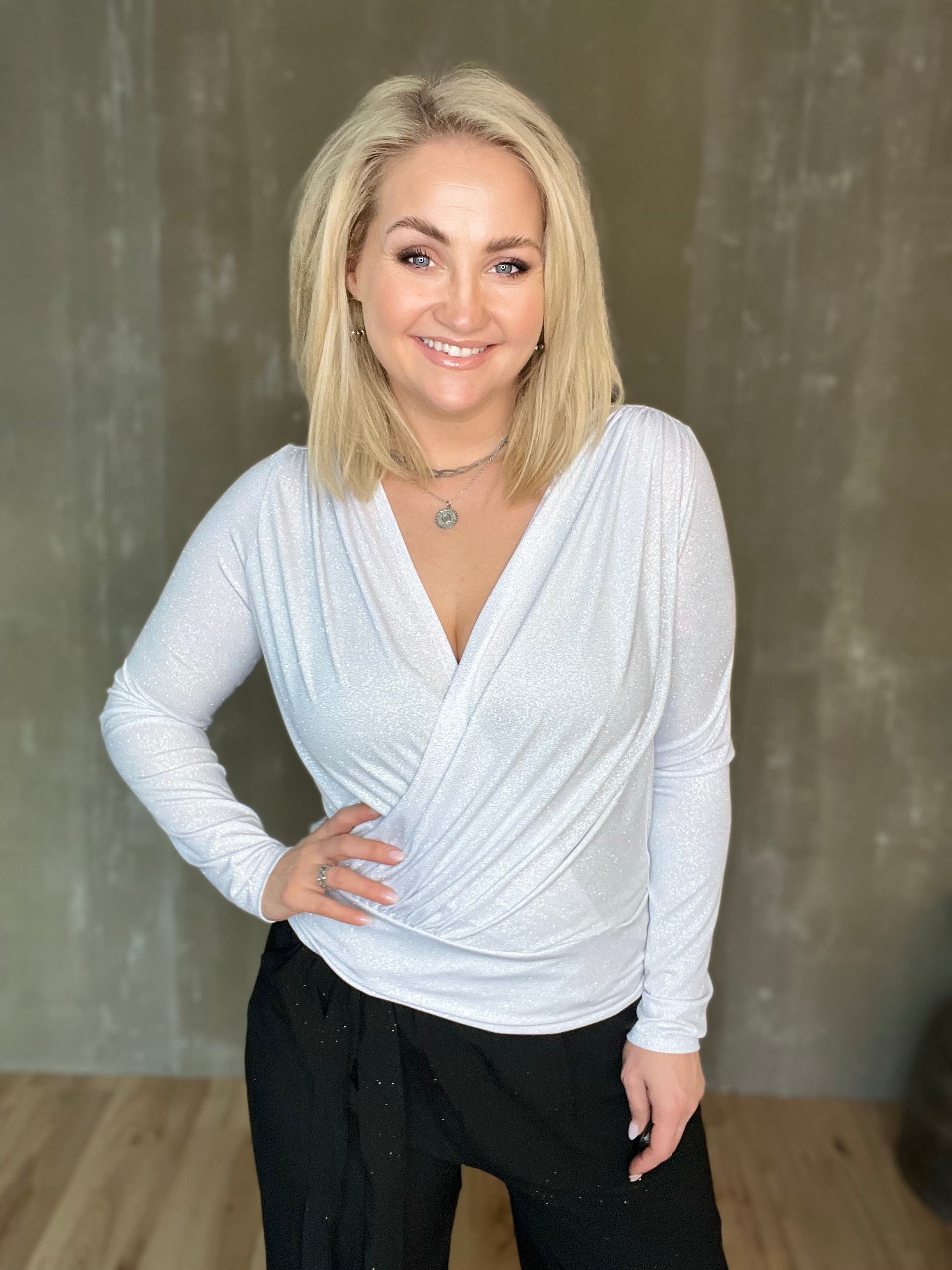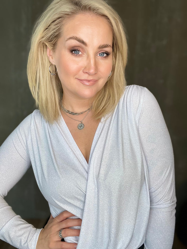 Vöndur topparnir eru dásamlega þægilegir og sparilegir efri partar. Þeir eru úr mjúku og teygjanlegu efni og framstykkin liggja í víxl að framan, neðan svo hægt er að girða þá í buxur eða pils. Bakið er með aukinni vídd og eru þeir með þröngum ermum.