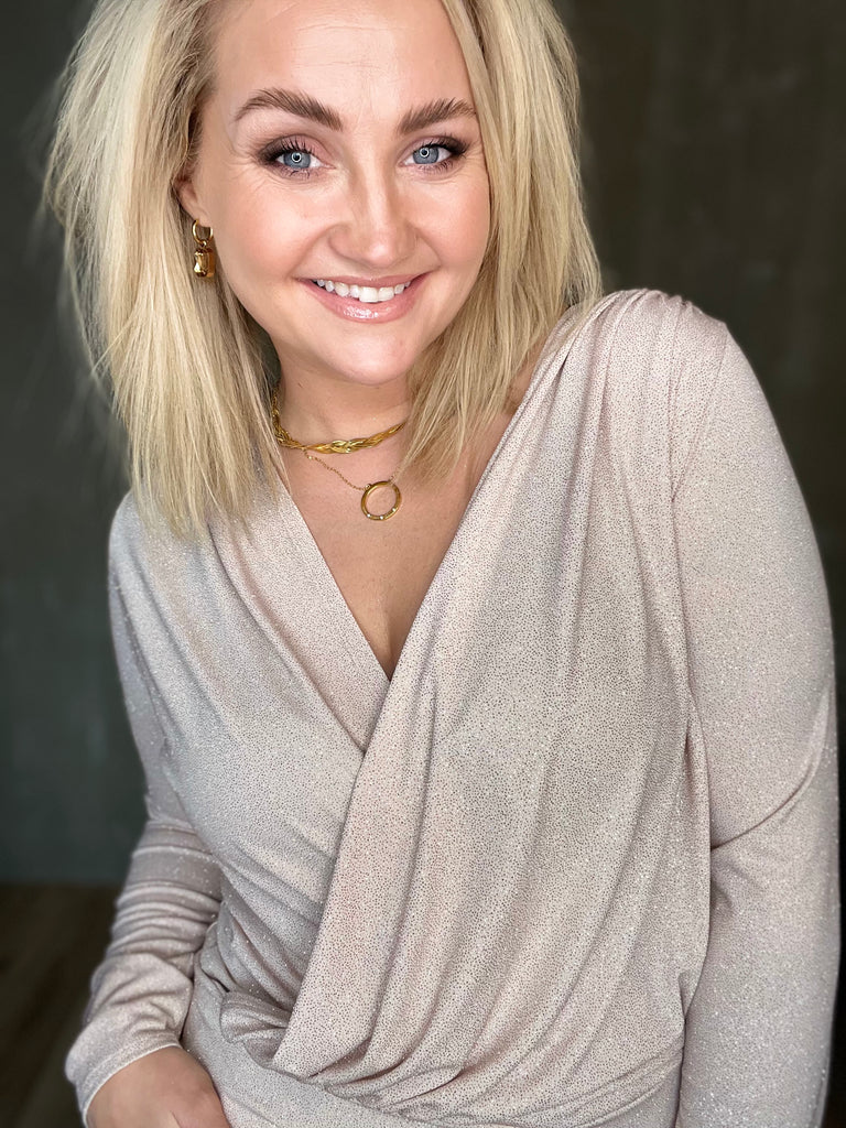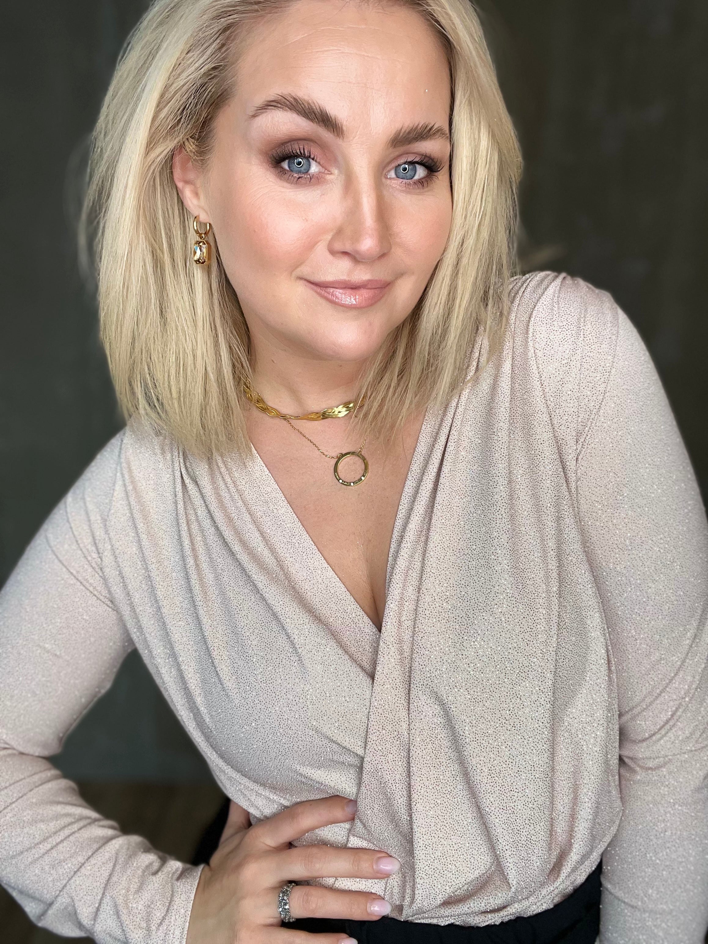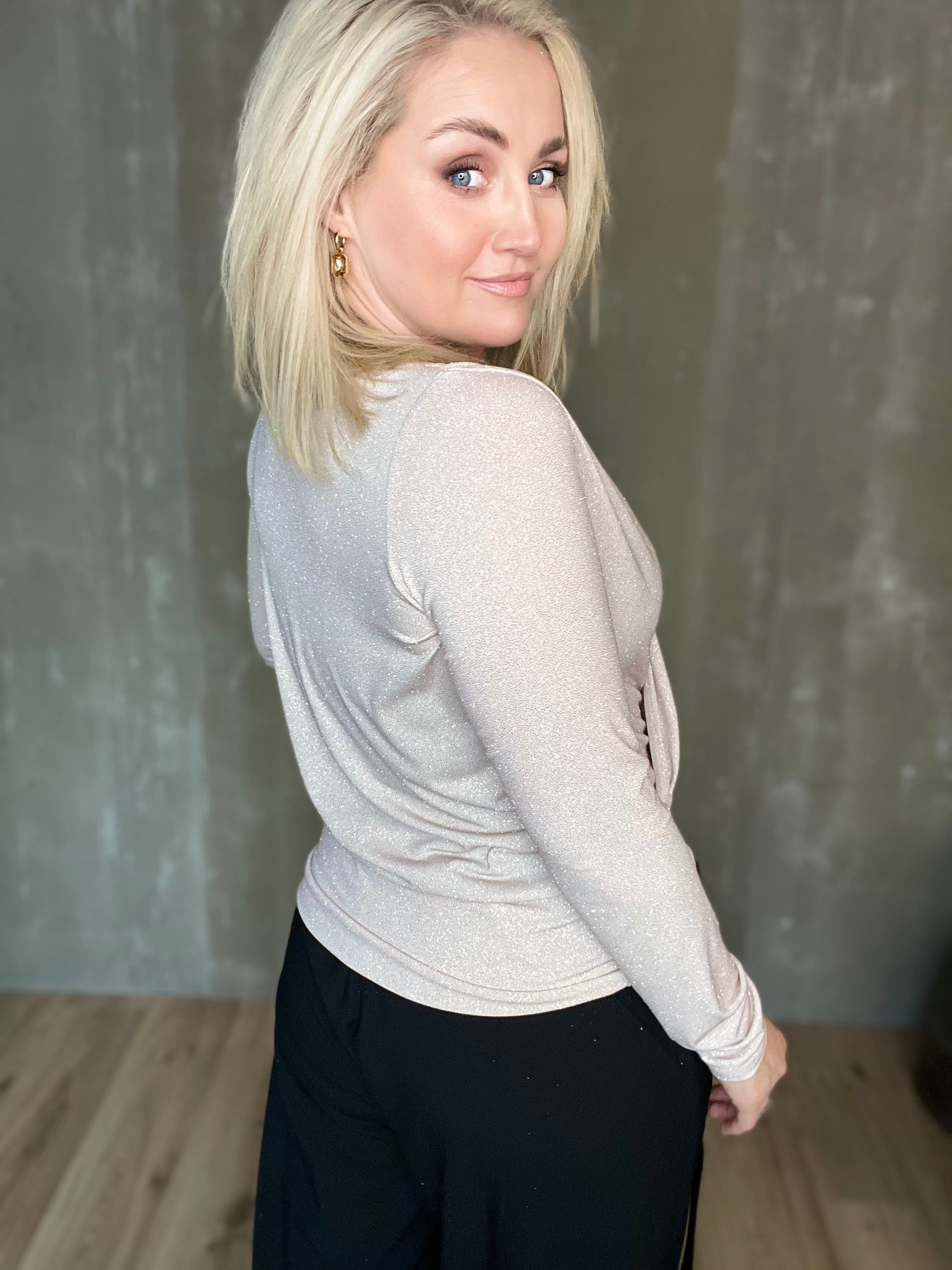 Vöndur topparnir eru dásamlega þægilegir og sparilegir efri partar. Þeir eru úr mjúku og teygjanlegu efni og framstykkin liggja í víxl að framan, neðan svo hægt er að girða þá í buxur eða pils. Bakið er með aukinni vídd og eru þeir með þröngum ermum.
